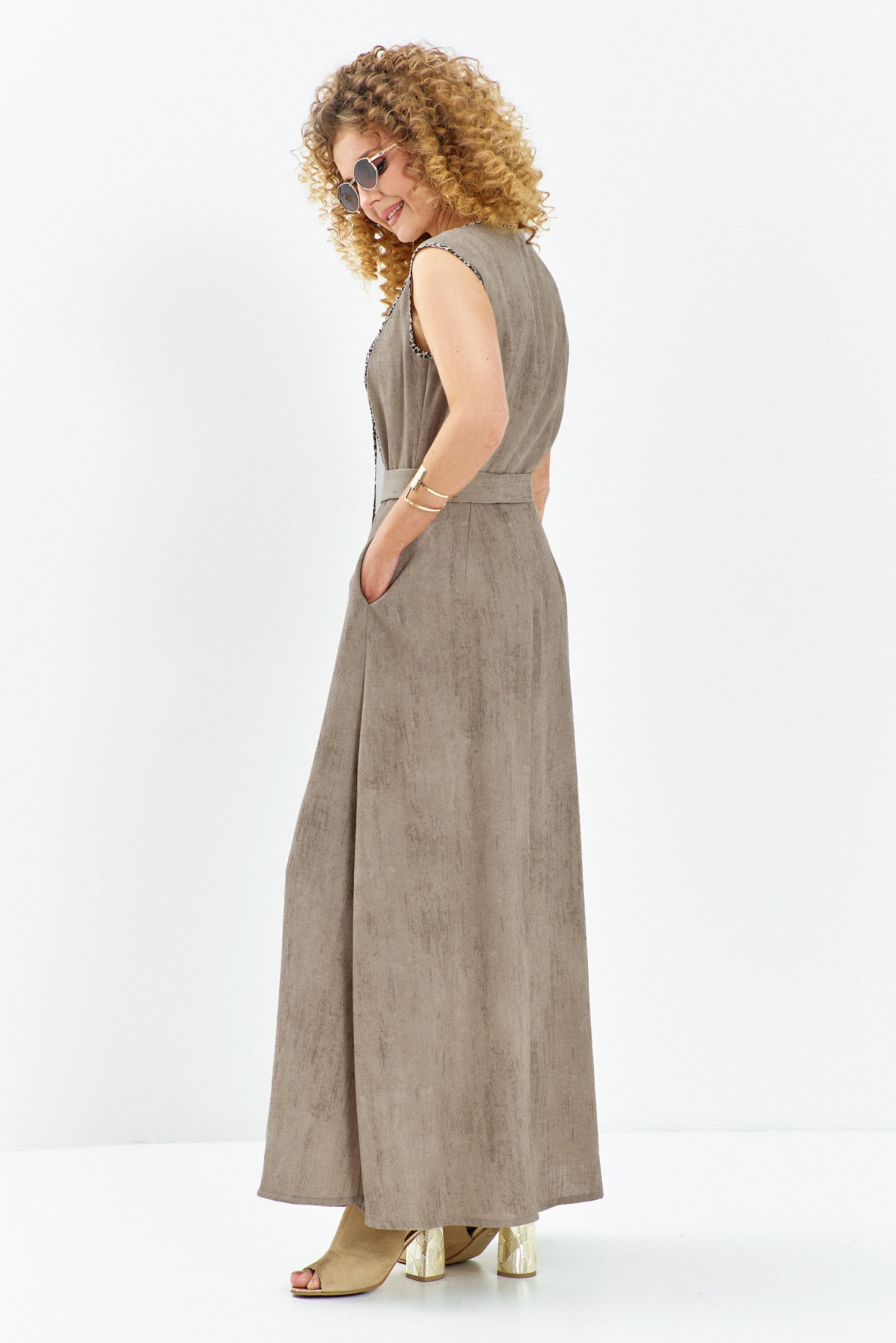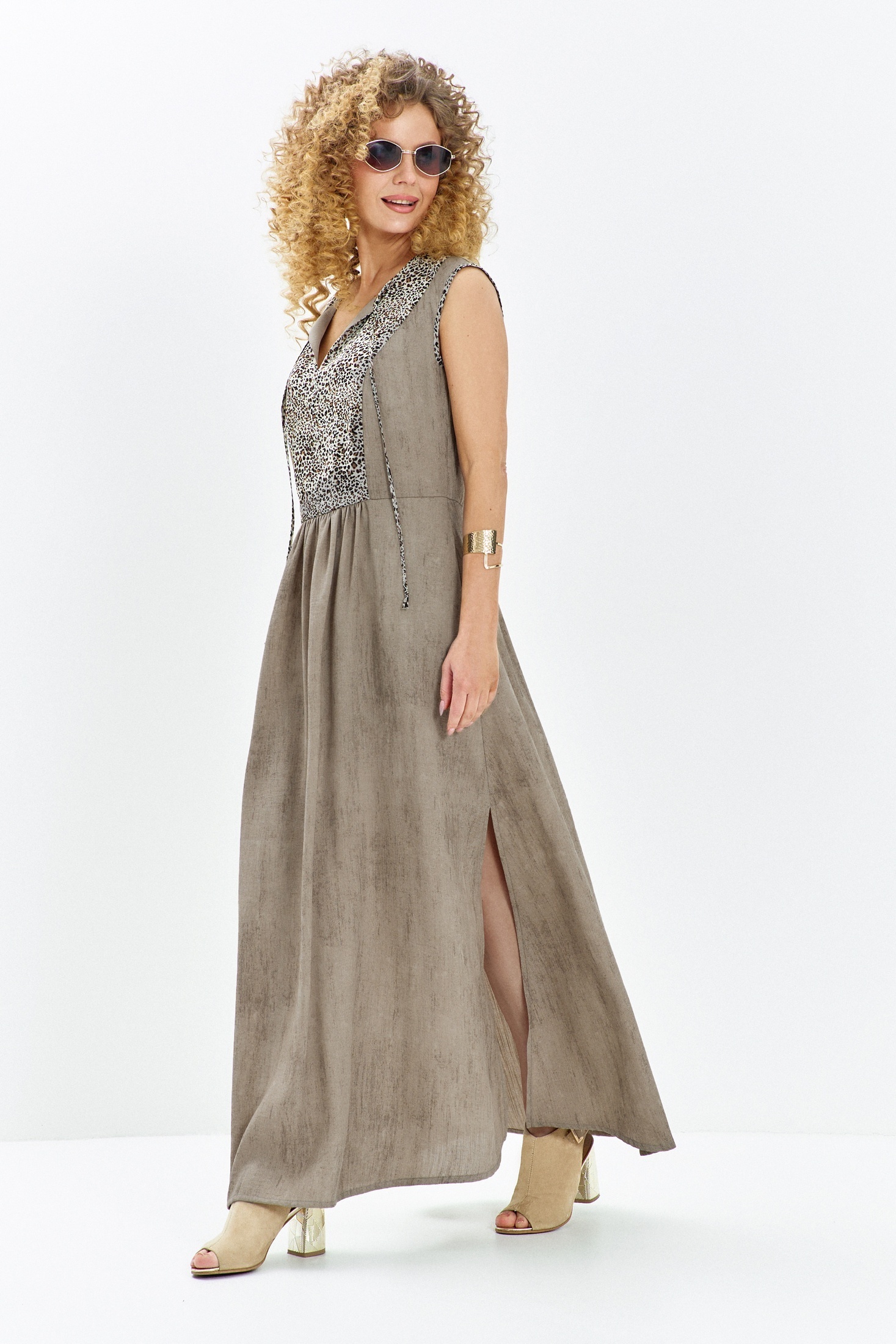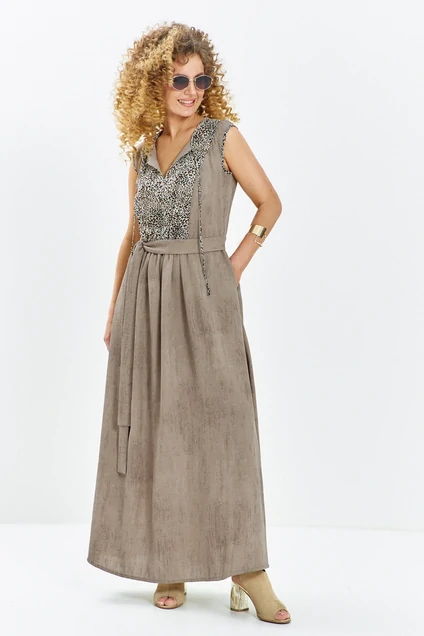 Платье 715 бежевый + леопардовый от Euro Moda — это воплощение грациозности и стиля. Коллекция бренда Euro Moda предлагает макси-платье свободного кроя, изготовленное из мягкой вискозной ткани с добавлением нейлона. Эффект «stone wash» в песочно-бежевом оттенке дарит материалу натуральный вид, а леопардовый принт на лифе добавляет нотку интриги. Тонкие завязки по горловине и изящный пояс акцентируют внимание на талии, создавая женственный силуэт. Быстрый доступ благодаря удобным карманам. Этот стильный и удобный наряд станет идеальным выбором для вечеринки или торжественного мероприятия в межсезонье. Бежевая палитра позволяет легко сочетать платье с разнообразными аксессуарами.