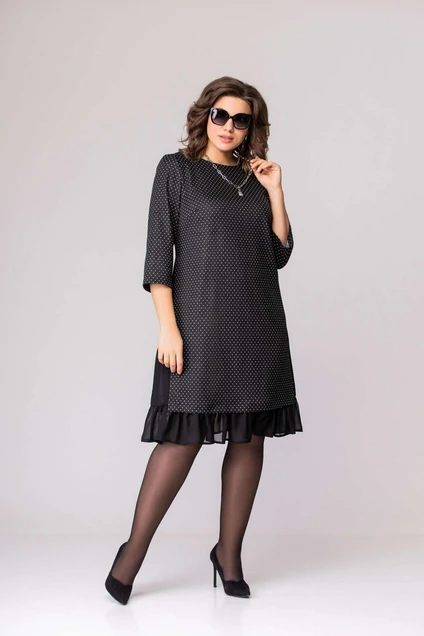 Платье женское нарядно-повседневное полуприлегающего силуэта слегка расширенное к низу, выполнено из трикотажного полотна в сочетании с шифоном. Вырез горловины "лодочкой" обработан обтачкой, рукав втачной 3/4. По низу платья волан из шифона, по спинке потайная молния. Декором служит вставки из шифона по боковым швам платья.