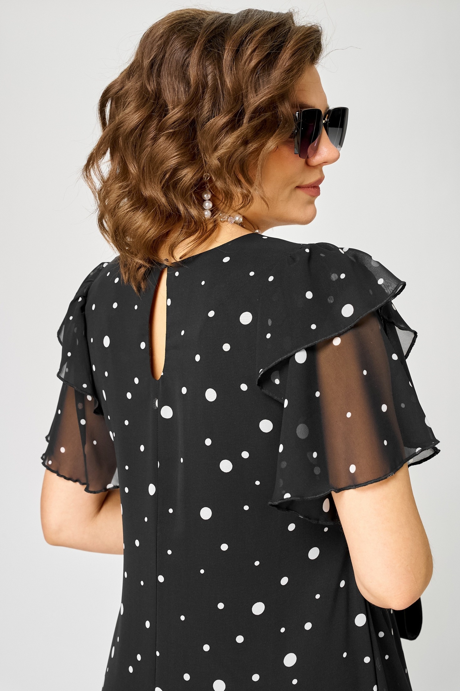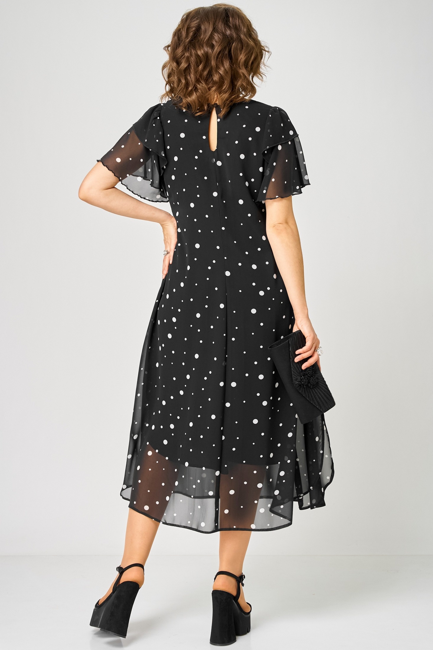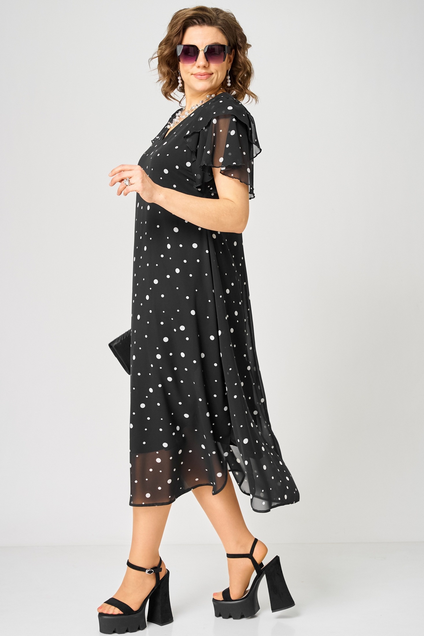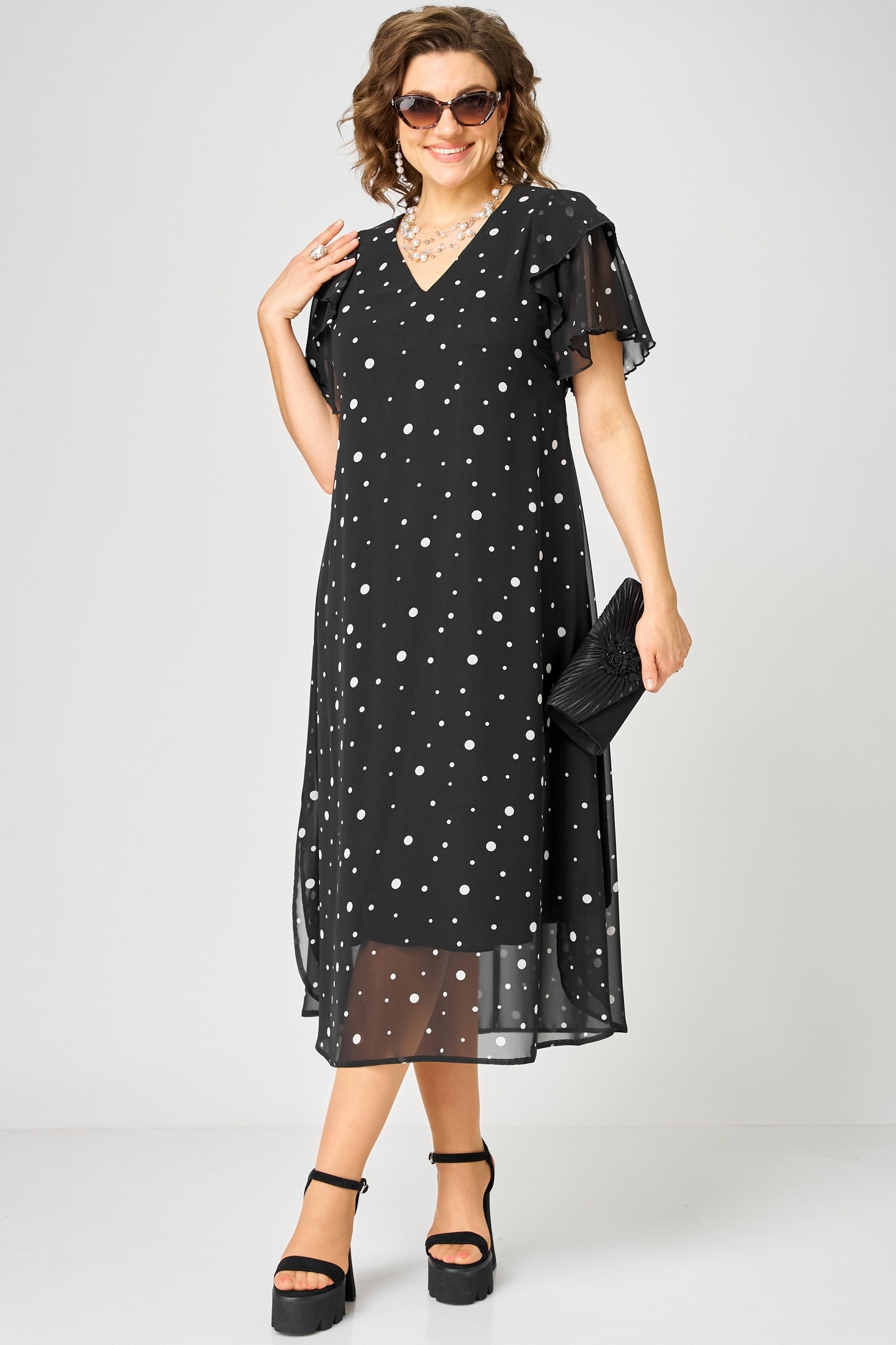 Платье 7116А черный горох EVA GRANT — идеальный выбор для стильного повседневного образа. Коллекция бренда EVA GRANT создана из легкого и воздушного шифона с подкладкой, что обеспечивает комфорт и свободу движений. V-образный вырез и воланы на рукавах добавляют изделию утонченный шарм. Фигурный низ с закругленными разрезами делает платье идеальным для теплого сезона. Благодаря ткани с гороховым принтом, это платье станет вашим любимым выбором для любого праздника или прогулки. Черный цвет придает платью универсальность и сочетается с любыми аксессуарами.