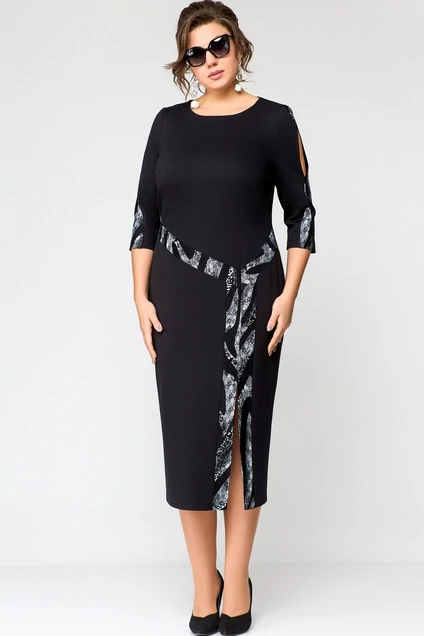 Платье женское нарядно-повседневное прилегающего силуэта выполнено из трикотажного полотна в сочетании с отделкой. Вырез горловины лодочкой, рукав втачной 3/4 по центру с отделочным элементом. По полочке нагрудные вытачки и ассиметричные вставки из отделочного трикотажа, разрез обработан с левой стороны, по спинке центральный шов и потайная застежка молния. Декором платья служит отделочные вставки по рукавам и переду платья .