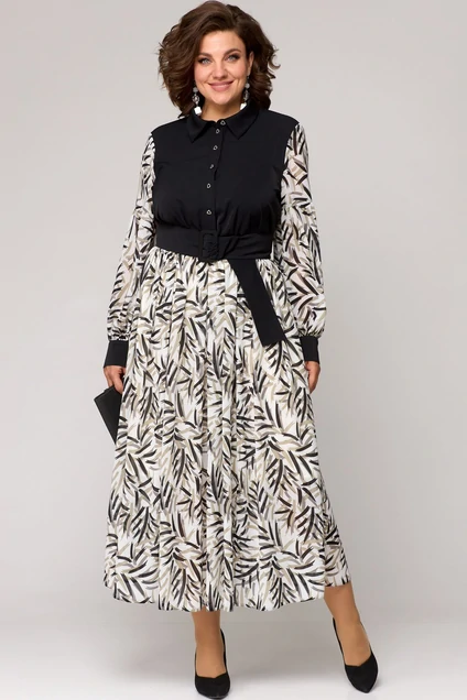 Платье женское нарядно-повседневное, выполнено из креп-шифона. Платье полуприлегающего силуэта, отрезное по талии. Юбка со складками на подкладке. Вырез горловины воротник на стойке рубашечного типа. Застежка до верху на обметанные петли и пуговицы. Рукав втачной на притачной манжете. По рукаву отрезнаыя деталь со сборкой. Декором служит сьемный пояс с пряжкой из основной ткани.