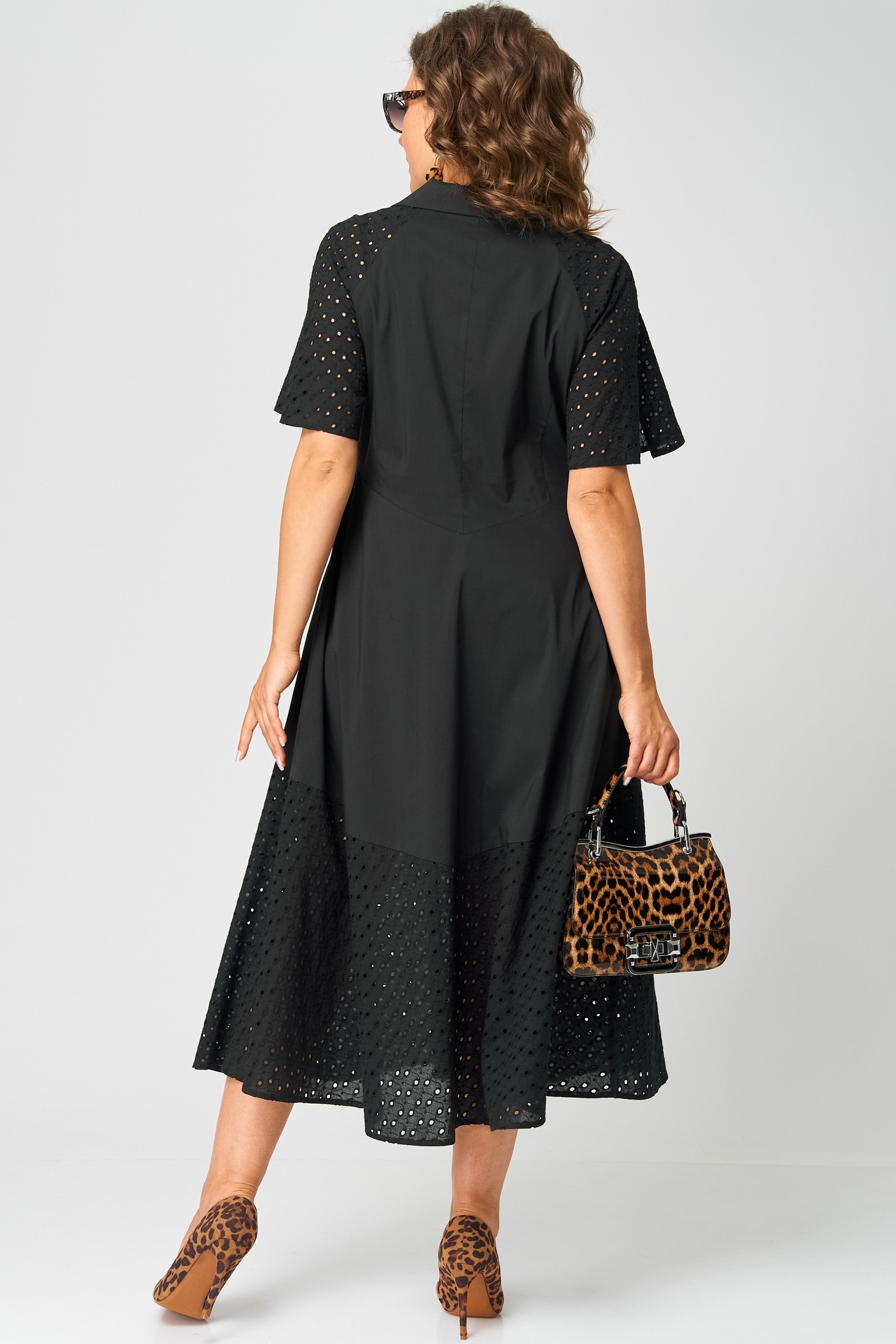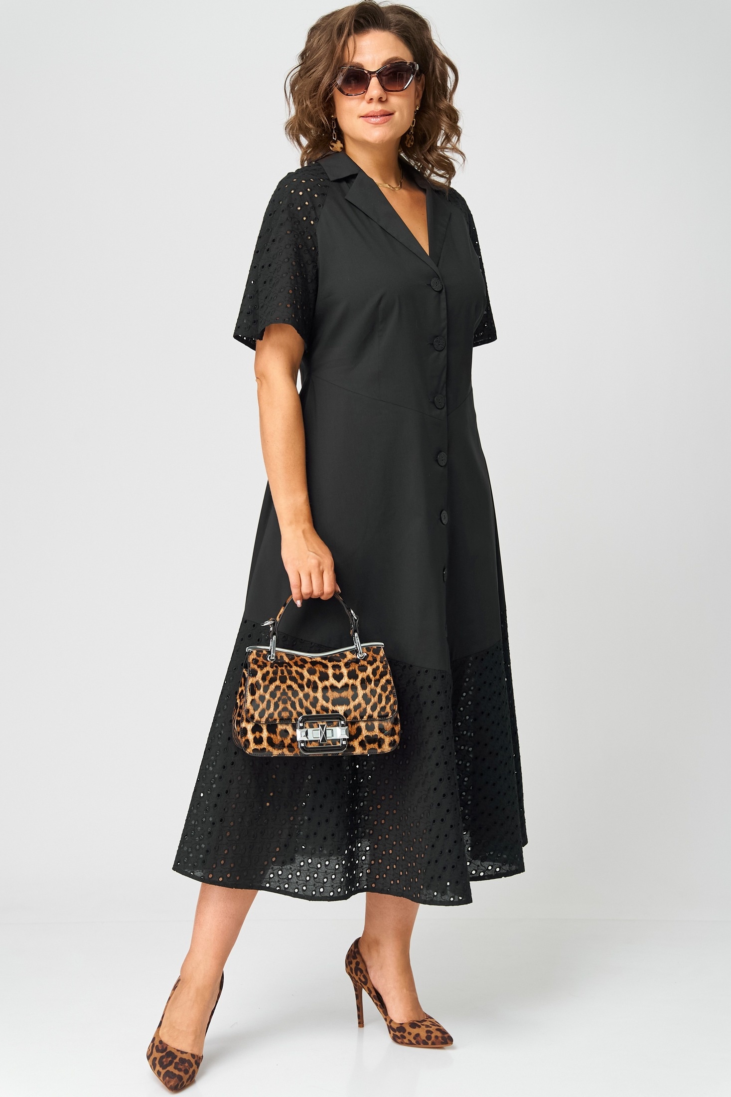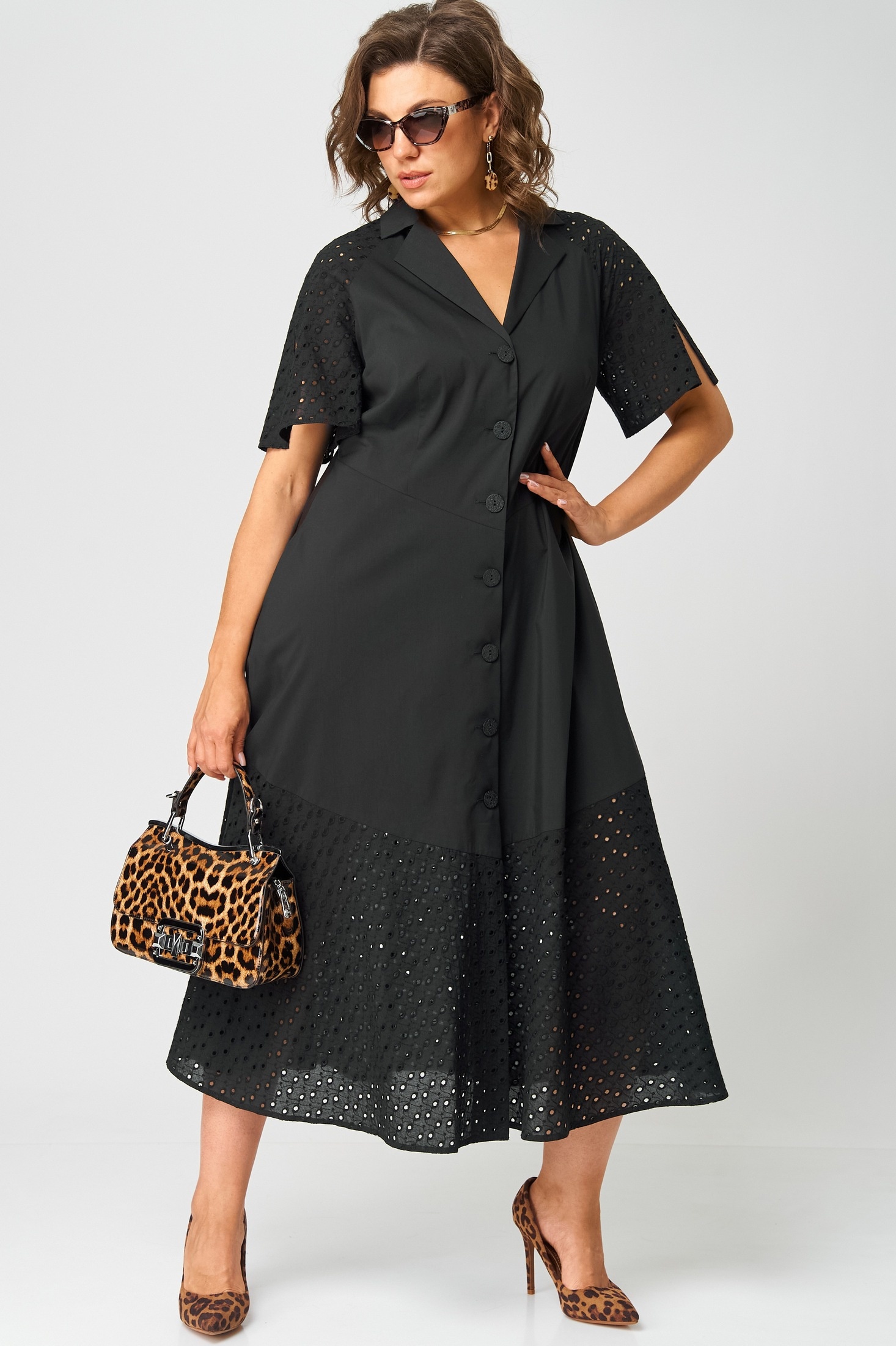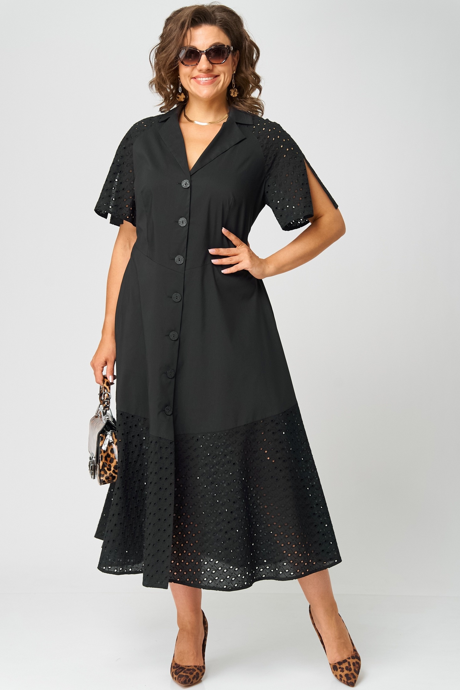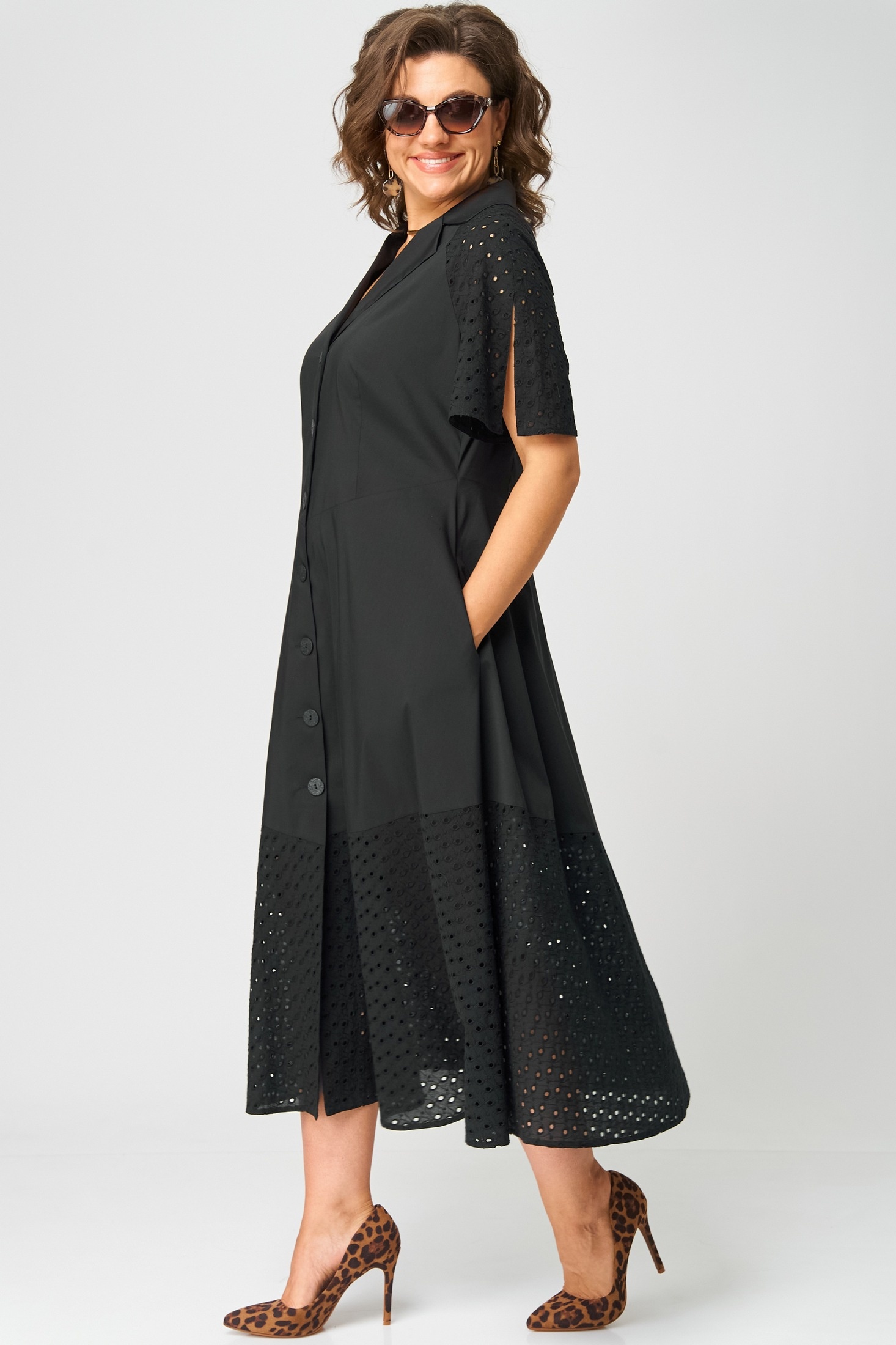 Платье 7216 черный EVA GRANT — идеальный выбор для стильных и уверенных в себе женщин. Коллекция бренда EVA GRANT предлагает наряд, который сочетает в себе комфорт и актуальные модные тенденции. Изготовлено из хлопка с добавлением полиамида и эластана, обеспечивая легкость и приятное ощущение на теле. Приталенный фасон подчеркивает женственность, а разрезы на рукавах и отделочные пуговицы добавляют изюминку образу. Платье выполнено в черном цвете, подходит для повседневного носки и праздников. Миди-длина с фигурным подрезом по талии и воланом по низу из шитья делает его универсальным выбором для любого сезона, будь то лето или начало осени.