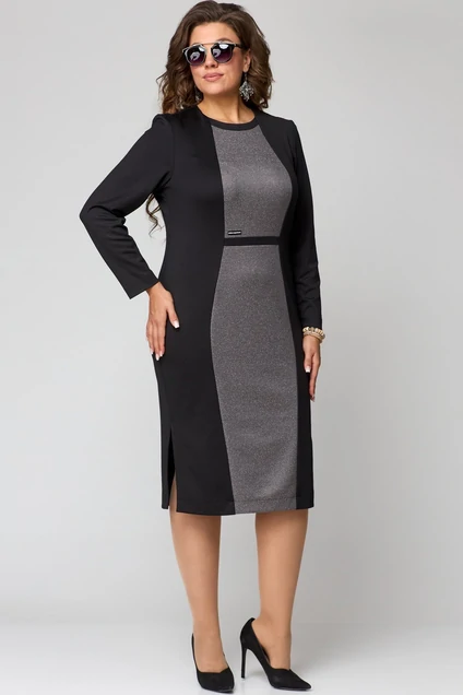 Платье женское нарядно-повседневное прилегающего силуэта выполнено из трикотажного полотна двух расцветок. Вырез горловины круглый на обтачке, рукав втачной. Центральная часть полочки фугурная из отделочной ткани. По линии талии вставка из ткани в виде пояса. В боковых швах обработаны разрезы. Спинка с центральным швом и потайной тесьмой молнией. Декором служит нашивка по центральной части полочки.
