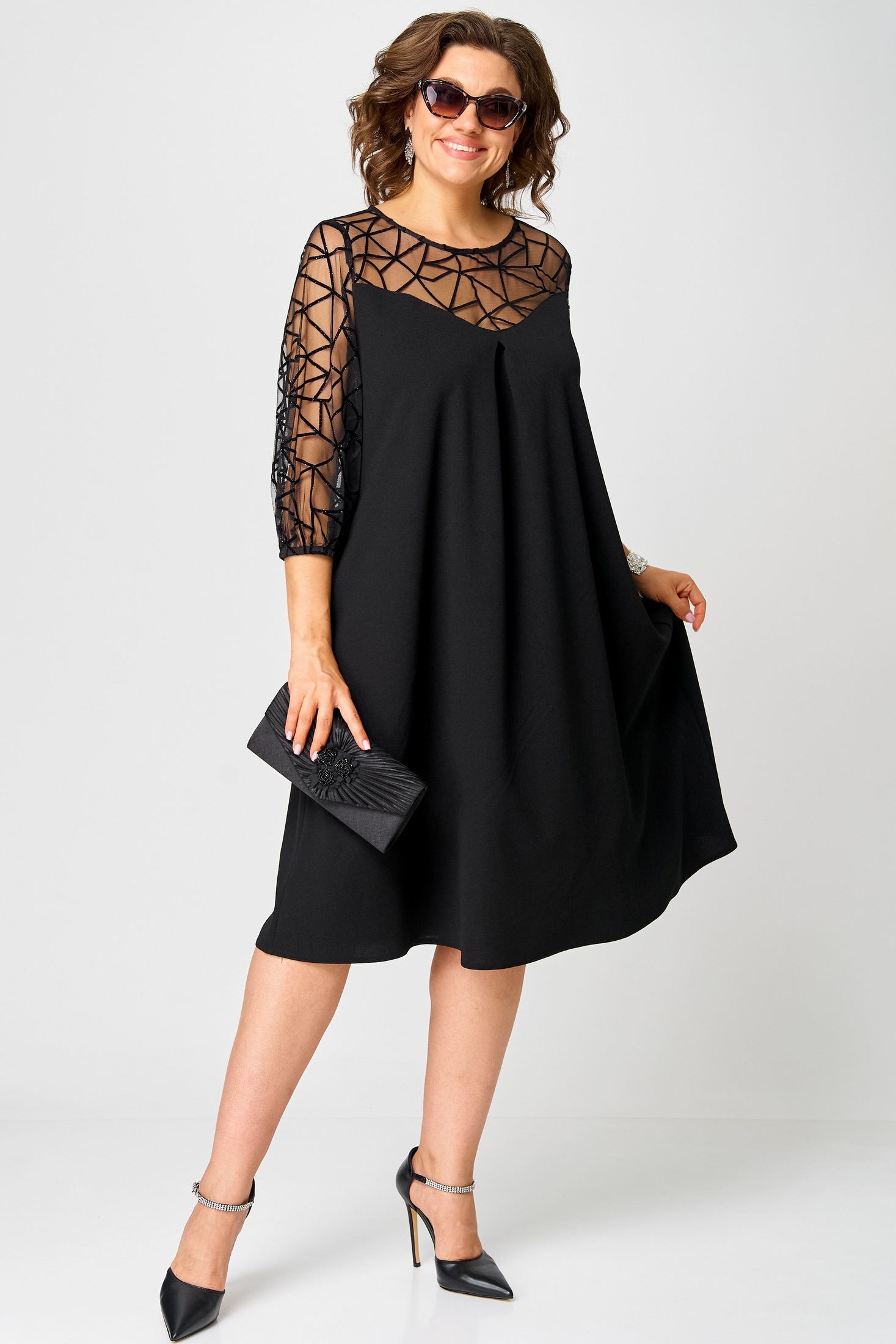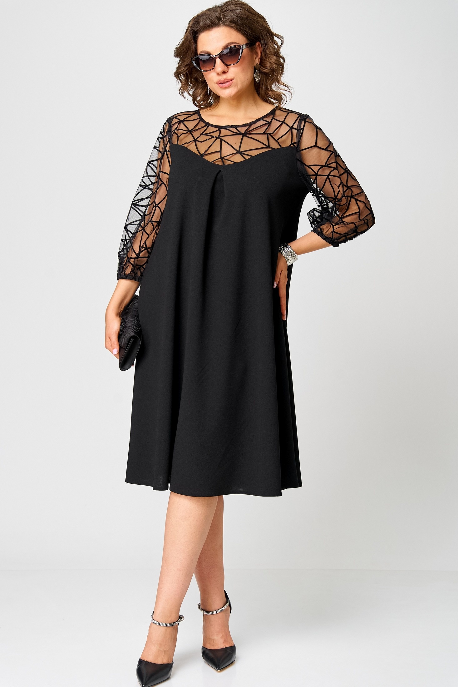 Платье 7279С черный EVA GRANT — это элегантное и нарядное платье А-силуэта из коллекции бренда EVA GRANT. Изготовлено из плательного крепа, что обеспечивает комфорт и долговечность носки. Круглый вырез горловины обработан косой бейкой, а рукав длиной 7/8 украшен изящной отделкой. Особенностью модели являются карманы в боковых швах и фигурная кокетка из отделочной ткани на передней части платья. Платье подходит для праздничных мероприятий осеннего и зимнего сезона, прекрасно подчеркивает женственность и изысканность. Черный цвет делает изделие универсальным дополнением к любому гардеробу, а фасон позволяет чувствовать себя уверенно и комфортно.