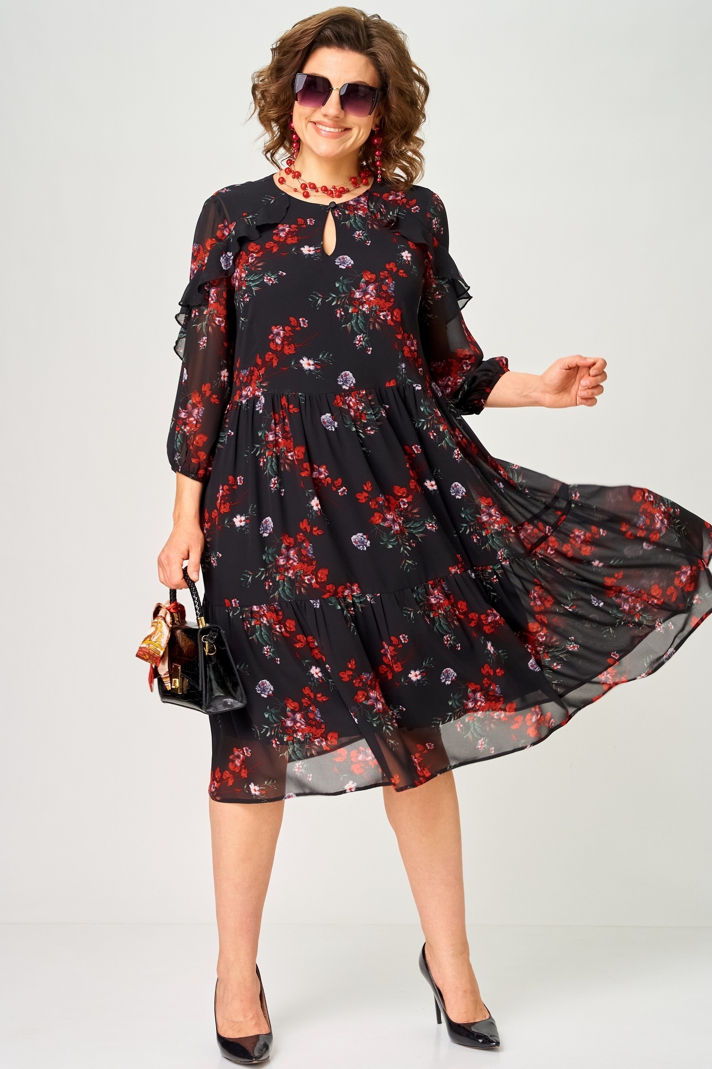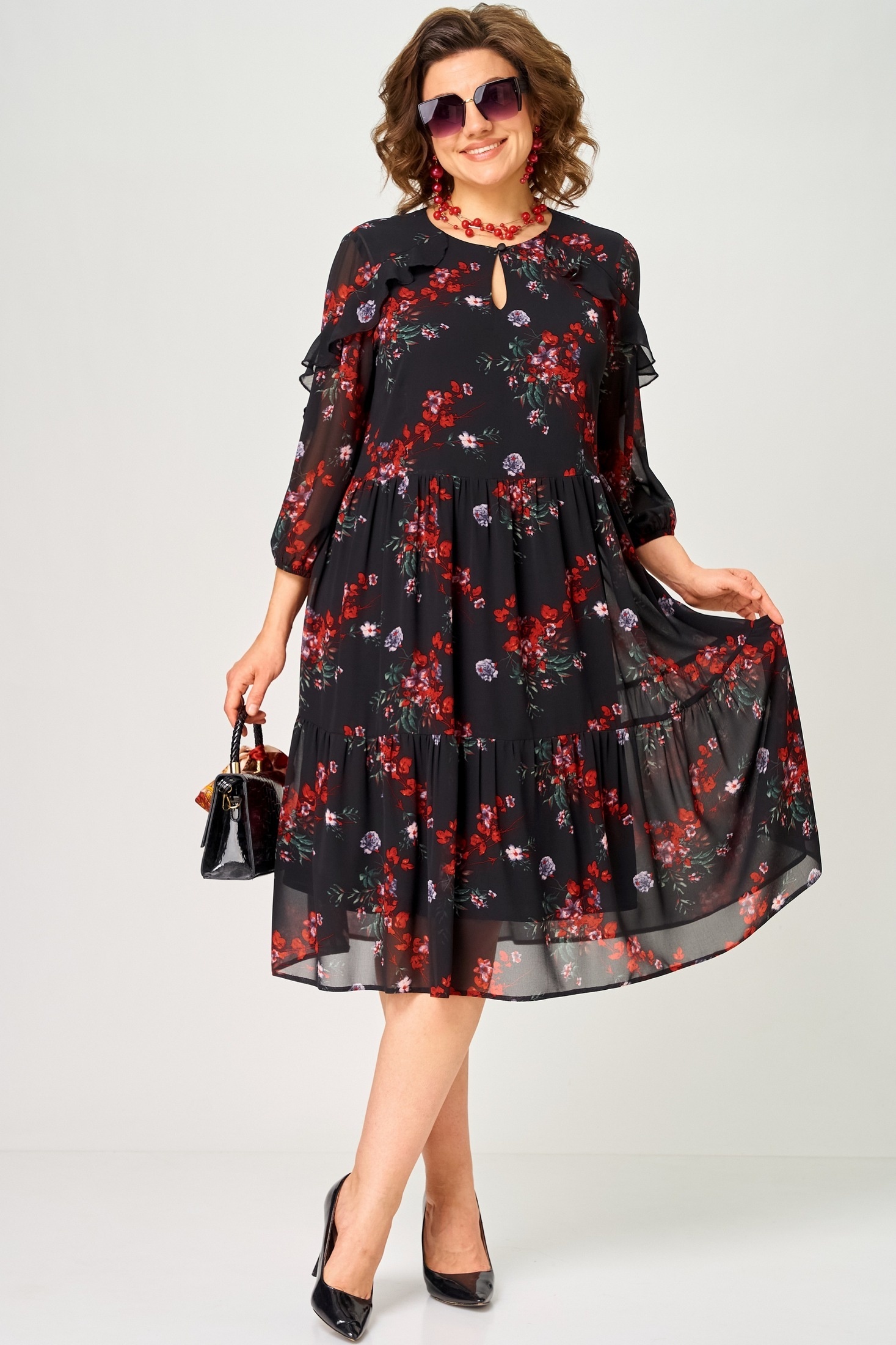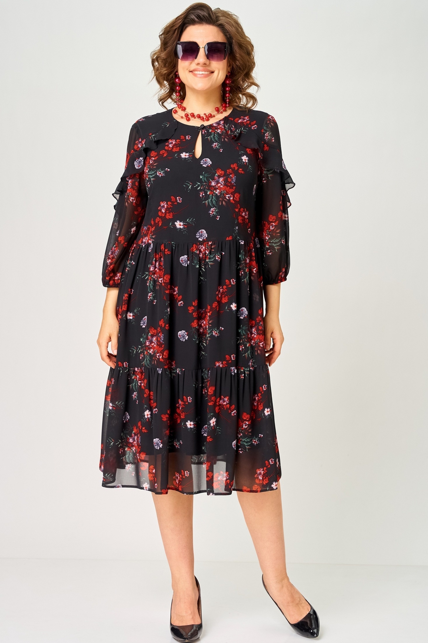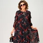 Платье 7281А цветочный принт EVA GRANT очаровывает своим нежным и легким образом. Коллекция бренда EVA GRANT сочетает в себе воздушный шифон и стильный цветочный принт. Прямой силуэт с воланами создаёт визуальную лёгкость и женственность. Вырез горловины округлый с декоративной "капелькой". Застежка оформлена на петлю с пуговицей. Рукава "фентези" 3/4 можно регулировать с помощью вставленной резинки. Платье идеально подходит для весны или лета и станет отличным выбором как для повседневной носки, так и для торжественных случаев. Чёрный цвет с контрастным цветочным узором добавляет образу шарма.