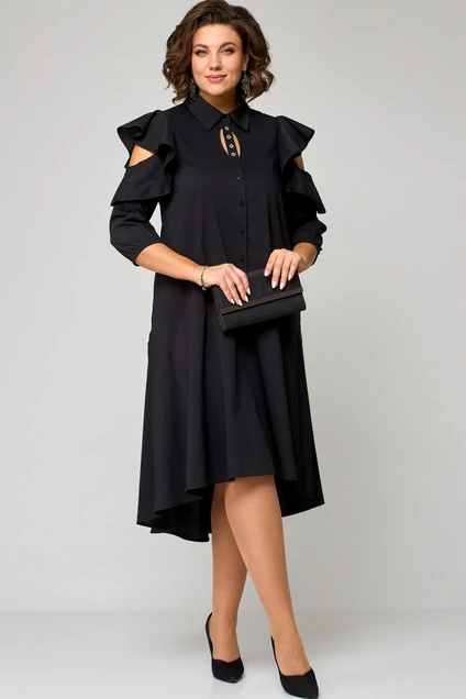 Платье женское нарядно-повседневное полуприлегающего силуэта расширенное к низу выполнено из хлопка. Вырез горловины вротник на стойке рубашечного типа. По центру переда планка с отделочным элементом. Рукав втачной "фэнтези" с частично открытым плечом, по низу рукав собран на резинку. Платье по линии бедер отрезное, в боковых швах обработаны карманы. Низ платья фигурный (по спинке длинее). Декором платья служат рукава и отделоные пуговицы со стразами по планке.