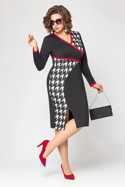 Платье женское нарядно-повседневное прилегающего силуэта, выполненоиз трикотажного полотна двух дизайнов в сочетании с отделкой. Вырез горловины V-образный на обтачках, рукав втачной по низу на притачной манжете из отделочной ткани. По переду платья ассиметричные подрезы с притачной отделкой. По спинке центральный шов с потайной застежкой молнией и небольшим разрезом по низу. Декором платья служат полоски из отделочной ткани.