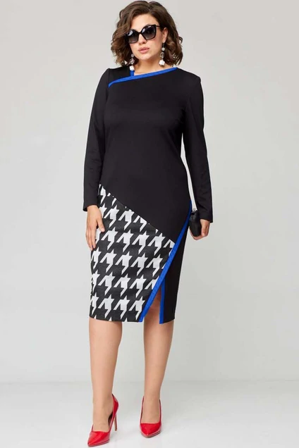 Платье женское нарядно-повседневное прилегающего силуэта, выполнено из трикотажного полотна разных дизайнов. Вырез горловины фигурный, обработан обтачками из отделочной ткани, рукав втачной, по полочке обработан разрез обработанный обтачками из отделочной ткани. Спинка с центральным швом и потайной застежкой молнией. Декором служит подрез по полочке и обтачки из отделочной ткани.