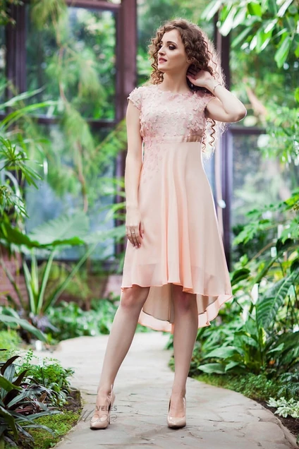 Платье женское выполнено в романтическом стиле. Сложная многослойная конструкция, не утяжеляет образ, а благодаря сочетанию легких и тканей, делает образ воздушным. Платье отрезное по линии талии, верх декорирован отделочной тканью, горловина - лодочка, рукав- короткий "крылышко" По спинке- застежка петля-пуговица, и декоративный вырез. Низ в платье ассиметричный.