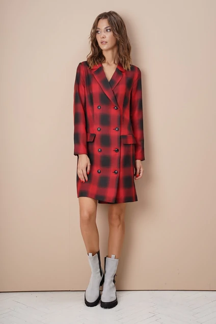 Вернувшее в моду элегантную женственность платье-пиджак который сезон будоражит умы дизайнеров и прекрасных дам. Нарочито мужского покроя оно в противоположность своему фасону подчеркивает женственночть своей обладательницы. Глубокий V-образный вырез подчеркнут четкой линией плеч, длинный рукав со шлицей и двубортная застежка с изящными отделочными пуговицами. Прорезной карман с клапаном на полочке и дополнительные вытачки для лучшего прилегания на спинке. Великолепная модель на все случаи жизни. Длина изделия в р.44-46 ок 92 см, р.48-50 ок.96 см, р.52-54 ок.100 см. Длина рукава ок.60 см.