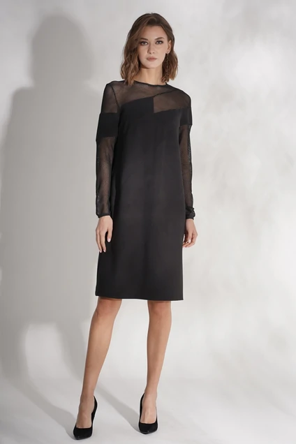 Продемонстрировать вашу индивидуальность, раскрыть ее новыми гранями и подарить праздничное настроение…Для этого создавалось это платье. Предельно утонченное и изящное, упрямленного "шифт" силуэта с неординарным ассиметричным решением конструктивных линий. Полочка с кокеткой из отделочной трикотажной сетки, рельефами, акцентирующими диагональ, и зрительно вытягивающим силуэт. Спинка со средним швом. Рукав из отделочного полотна с ассиметричными вставками из основного. Длина платья около 97 см. Длина рукава около 60 см.
