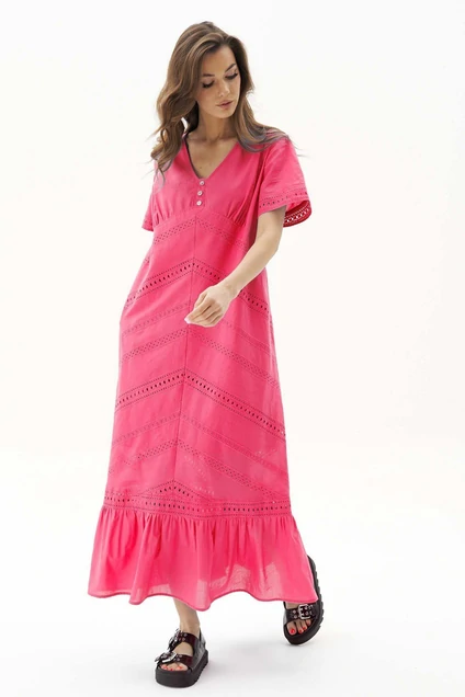 Лето, жара и платье с геометрической вышивкой из необыкновенно деликатного хлопкового батиста. Не слишком броское, но запоминающееся, оно выделяет вас из толпы, но делает это ненавязчиво. Свободный силуэт, втачной покрой, V-образный вырез горловины. Полочка с отрезным верхом с лёгкой сборкой в области рук. Нижняя часть платья выкроена под углом 45 градусов и эффектно соединяется по центру. Спинка с центральным швом, оригинальным подрезом и нижней частью сходящейся под углом 45 градусов. По низу платья эффектный волан.