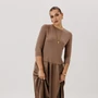 Свободный А-образный силуэт, изящный покрой выше линии талии, подтягивающаяся кулиса с завязкой и романтичный волан.