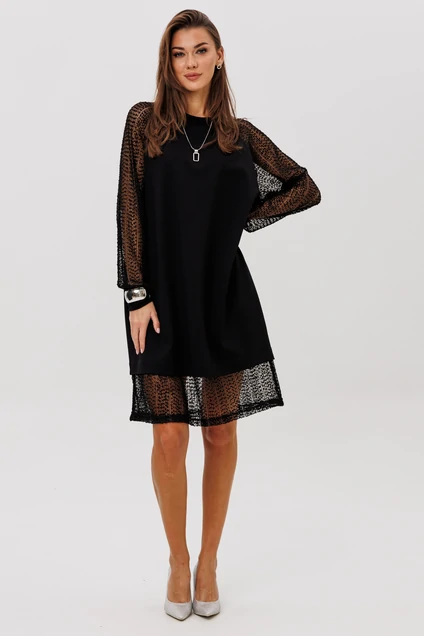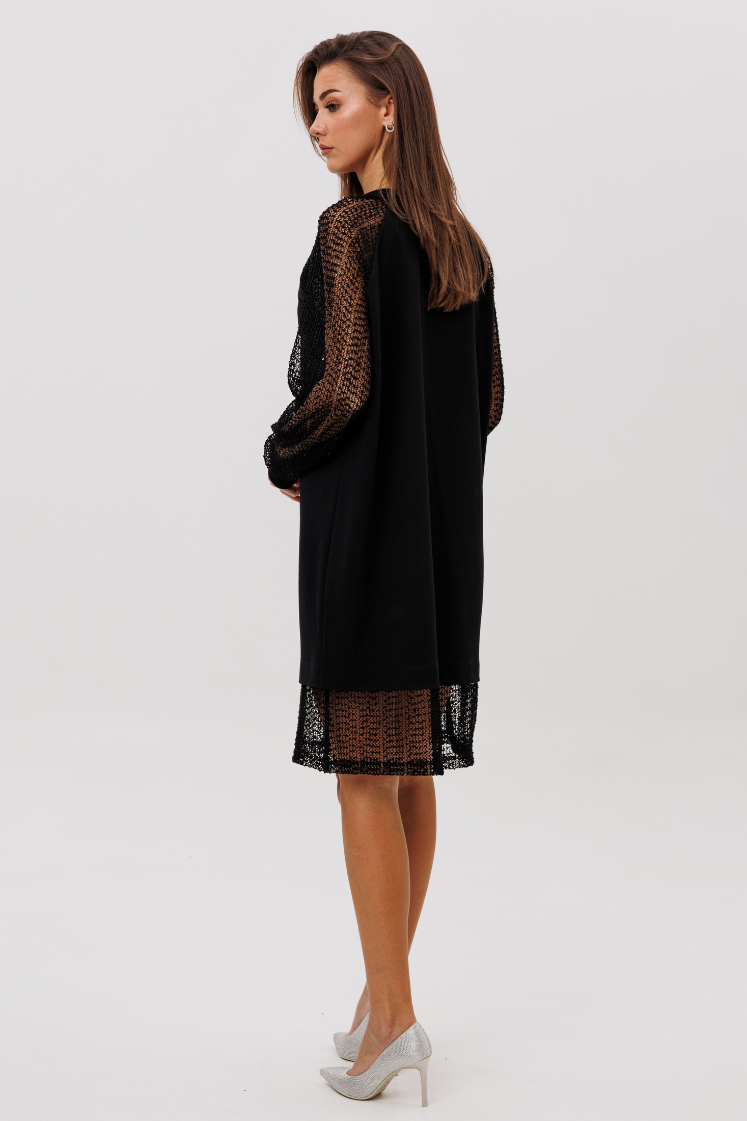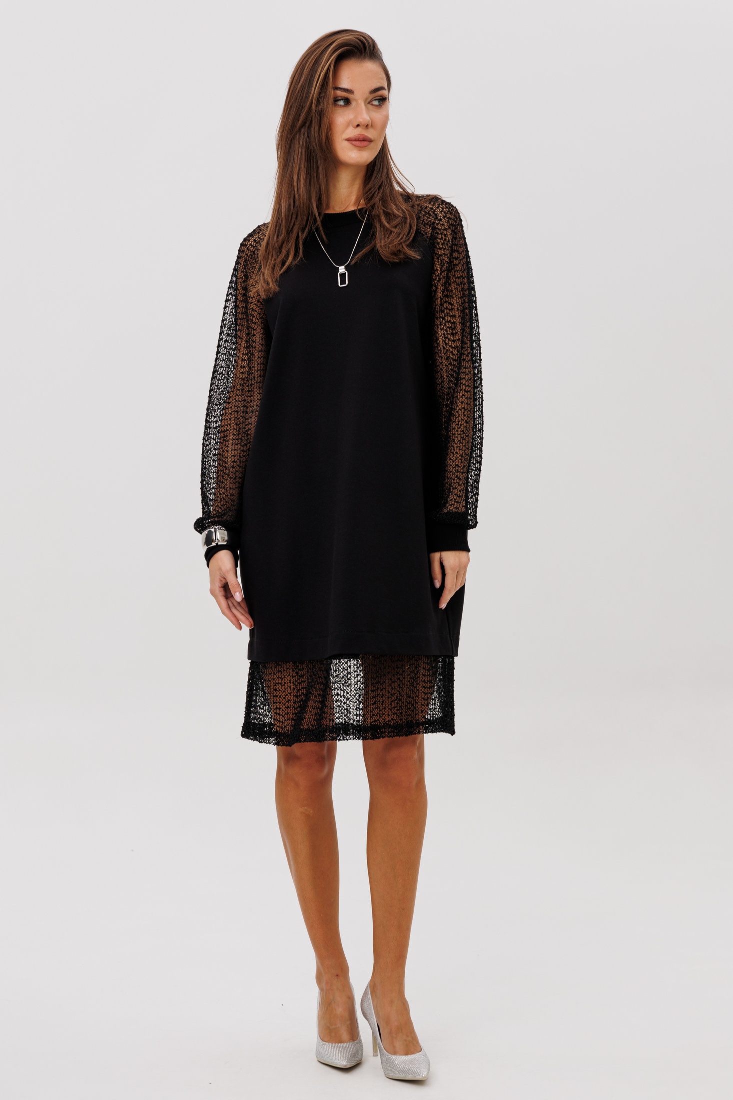 Стильное платье прямого кроя выполнено из комфортного, мягкого вискозного полотна с добавлением нейлона, которое красиво драпируется и не сковывает движения. Особый акцент — мерцающие прозрачные рукава и нижняя часть изделия, выполненные из изящной сетки с микропайеткой. Такой деликатный блеск добавляет образу утончённости и лёгкой вечерней нарядности. Модель смотрится современно и женственно: лаконичный верх гармонично сочетается с воздушной фактурой сетки, создавая стильный многослойный эффект. Платье подойдёт как для торжественных случаев, так и для выхода в свет, даря ощущение уверенности и элегантности.