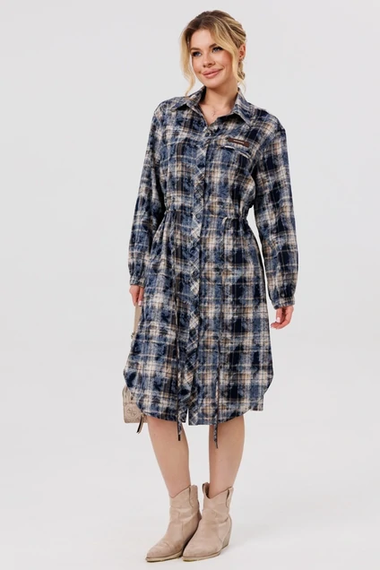 Элегантное платье в классическом стиле с красивым клетчатым принтом в сине-бежевых тонах. Эта модель с рубашечным воротником и длинными рукавами идеально сочетает в себе комфорт и модные тенденции. Платье выполнено из качественной плательной ткани, обеспечивающей приятное ощущение при носке и легкость ухода. Свободный силуэт платья дополнен акцентом на талии в виде элегантного пояса, что подчеркивает фигуру, сохраняя при этом легкость и непринужденность образа. Модель идеальна для повседневных мероприятий и офисных будней, добавляя шик и утонченность в дневной гардероб.