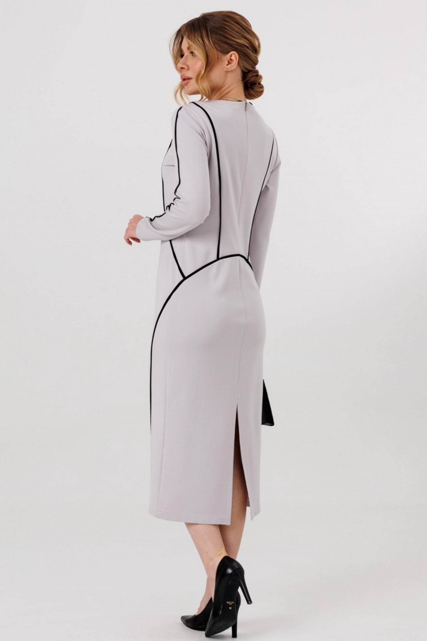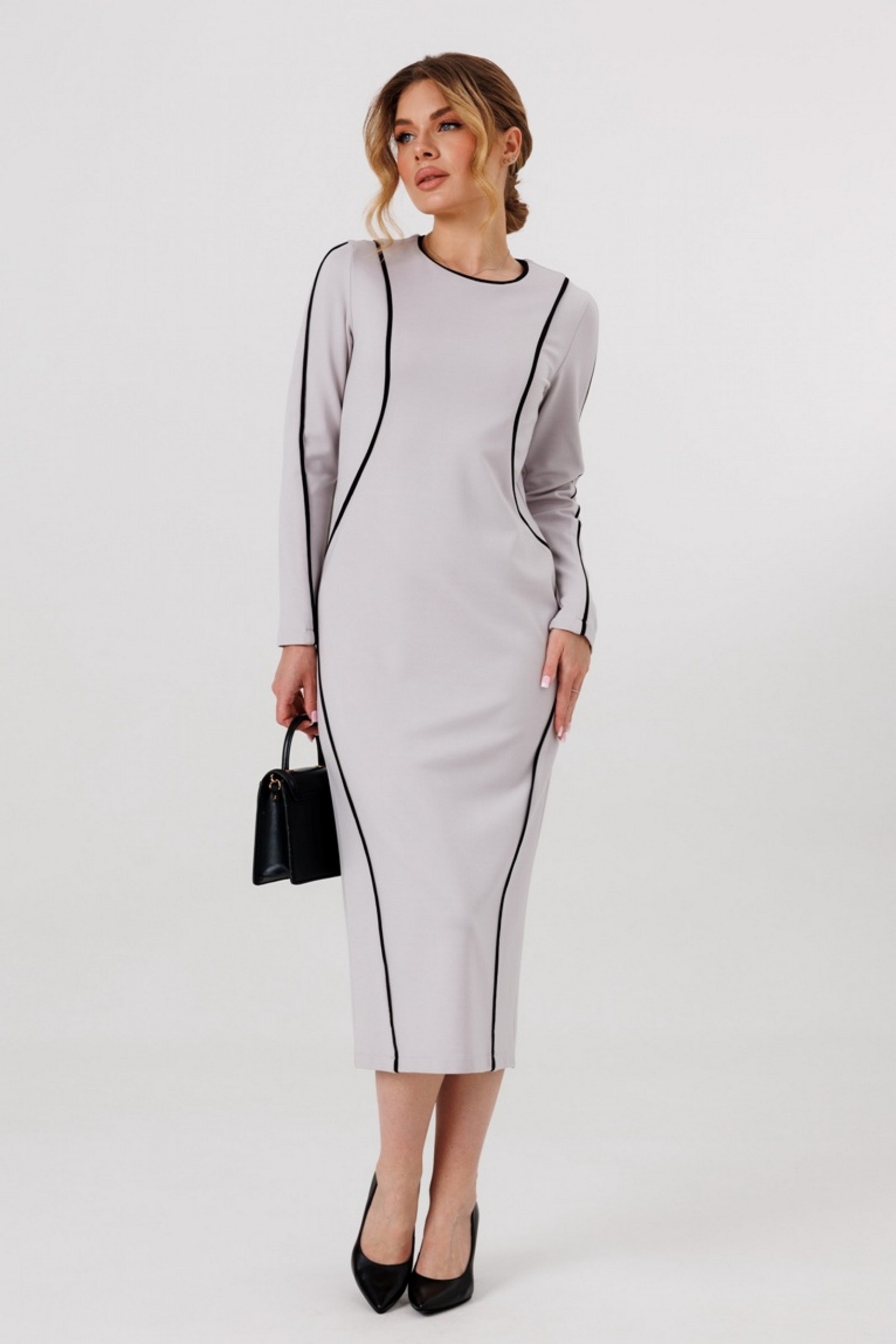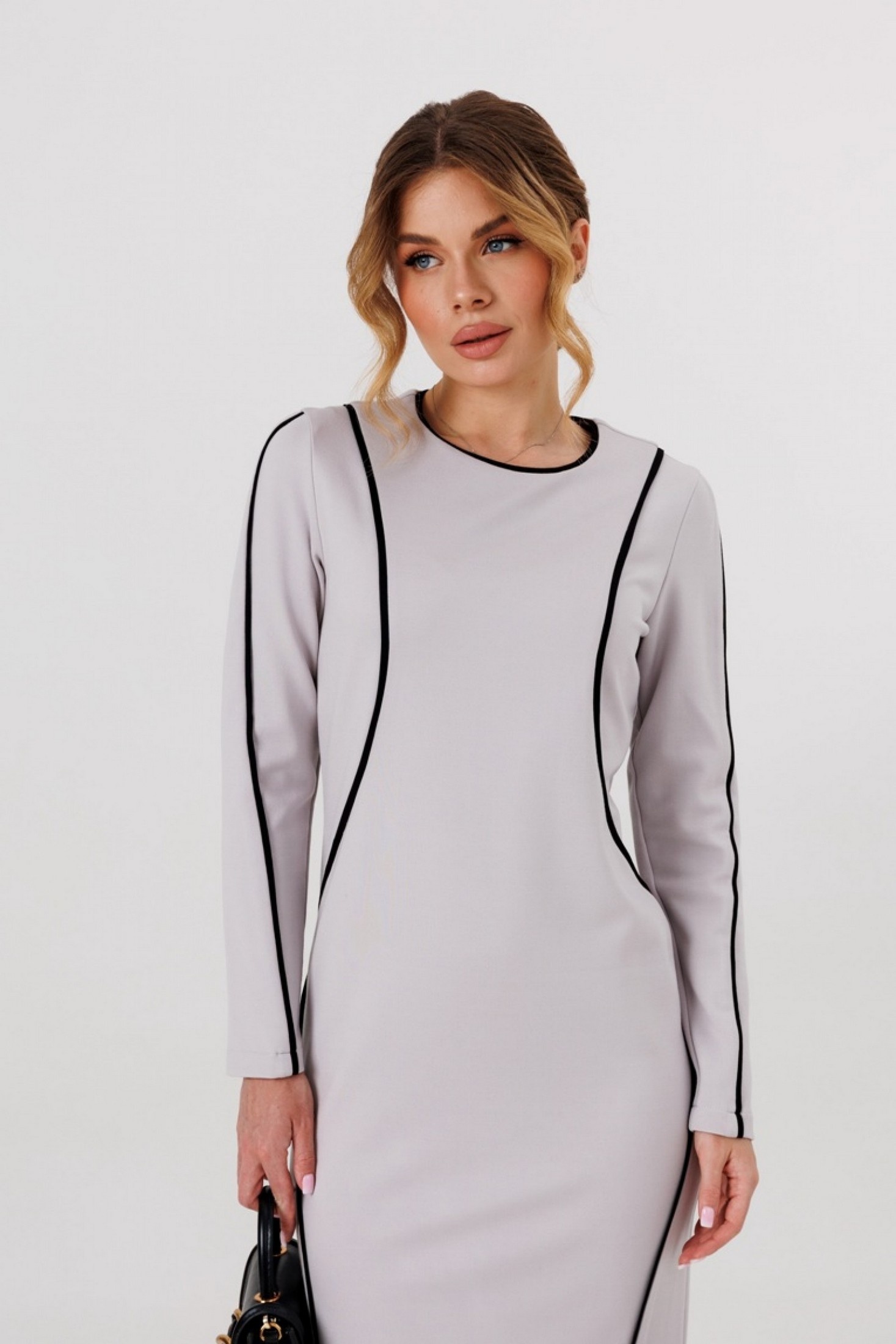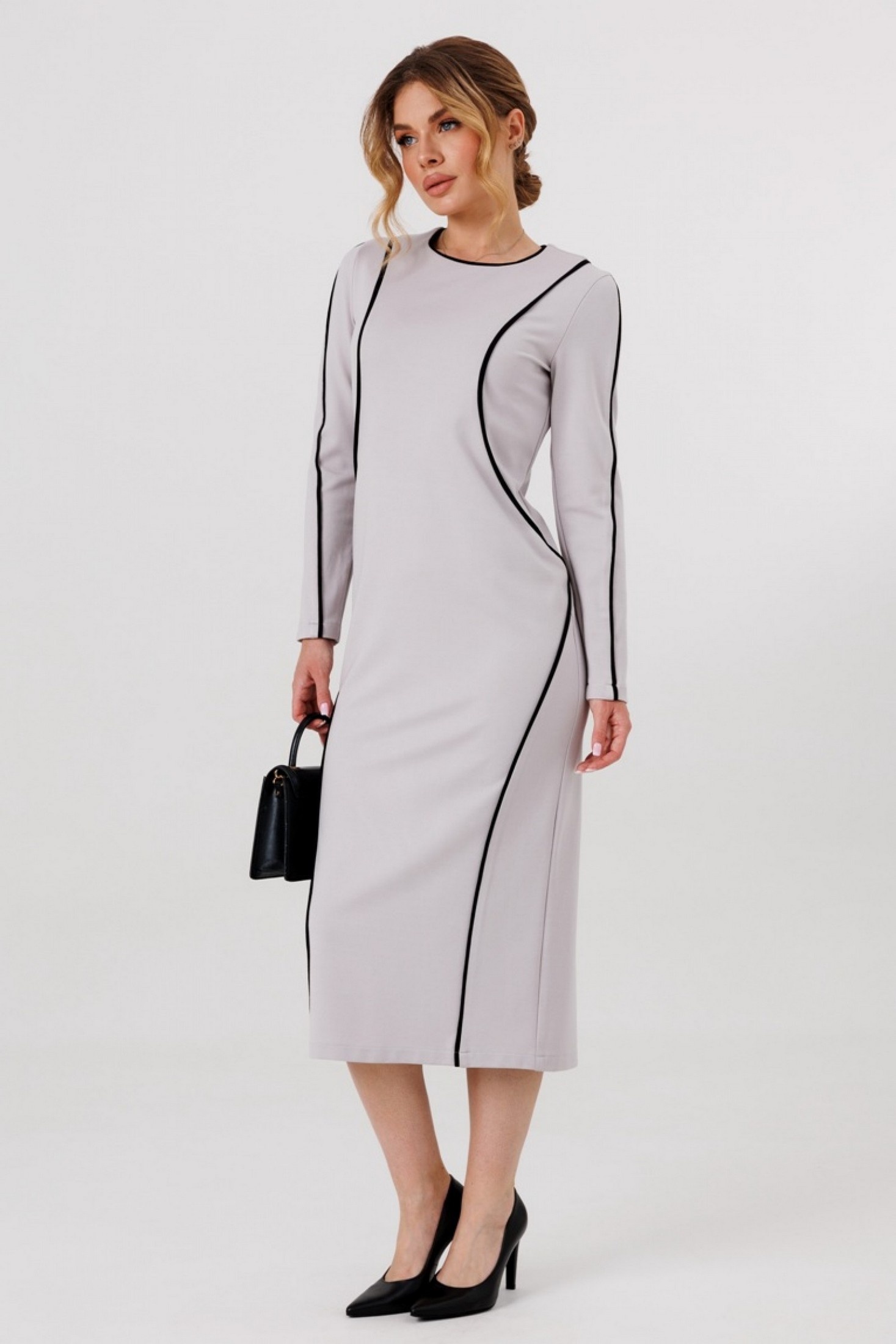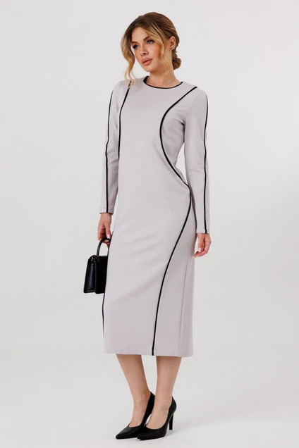 Женское платье средней длины из мягкого трикотажа, которое гарантирует комфорт и элегантность на каждый день. Представлено в нежно-сером оттенке, этот наряд выгодно подчеркивает фигуру благодаря полуприлегающему силуэту. Дизайн платья украшен контрастной черной окантовкой, идущей вдоль всего силуэта, что добавляет изделию изысканности и визуально стройнит силуэт. Округлый вырез горловины дополнительно подчеркивает изящество образа. Платье идеально сочетается с классической обувью на каблуке, что позволяет создать гармоничный и утонченный ансамбль для различных случаев.