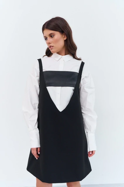 Сарафан А-силуэта с декоративной вставкой по груди. Характеристики: выполнен из костюмной ткани в черном цвете, по груди вставки из атласной ткани, сарафан на подкладке. Длина сарафана 90 см.