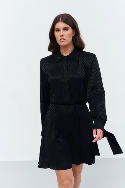 Платье приталенного силуэта с декоративными манжетами. Характеристики: выполнено из плательной ткани в чером цвете (плетение ткани зигзаг), отрезное по линии талии, верхняя часть переда с потайной застежкой на петли и пуговицы, по талии на резинке, низ рукава обработан декоративной манжетой. Длина платья 94 см, длина рукава 63 см.