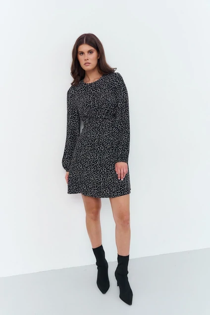 Платье приталенного силуэта с декоративным элементом по переду. Характеристики: выполнено из плательной ткани в чером цвете (горох), отрезное по линии талии, по верхней части переда обработан декоративный элемент, по спинке застежка-молния, низ рукава на резинке. Длина платья 93,5 см, длина рукава 64,5 см.