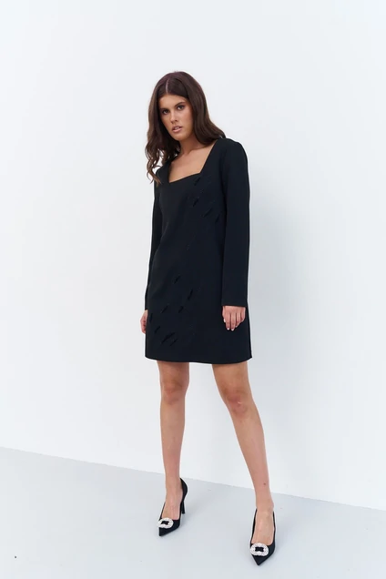 Платье прямого силуэта с вышивкой по переду. Характеристики: выполнено из плательной ткани в чером цвете, платье на подкладке, вырез горловины - каре, по спинке застежка-молния, рукав двухшовный. Длина платья 88,5 см, длина рукава 62 см.