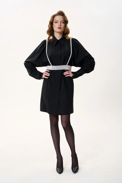 Платье-рубашка свободного силуэта. Характеристики: выполнено из рубашечной ткани в черном цвете, застежка на петли и пуговицы, рукава рубашечные со сборкой по окату и низу, низ рукава обработан манжетой на петли и пуговицы. В комплект входит декоративный пояс из бусин, сзади регулируется на шнуровку. Длина платья по переду 92,5 см, длина рукава 63,5 см.