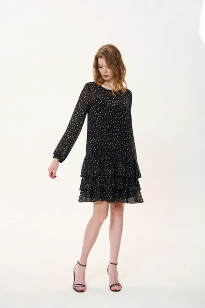 Платье свободного силуэта. Характеристики: выполнено из шифоновой ткани с принтом в черном цвете, по низу платья воланы, низ рукава обработан эластичной тесьмой (резинкой), нижнее платье выполнено из трикотажного полотна на регулируемых бретелях. Длина платья 92 см, длина рукава 62 см.
