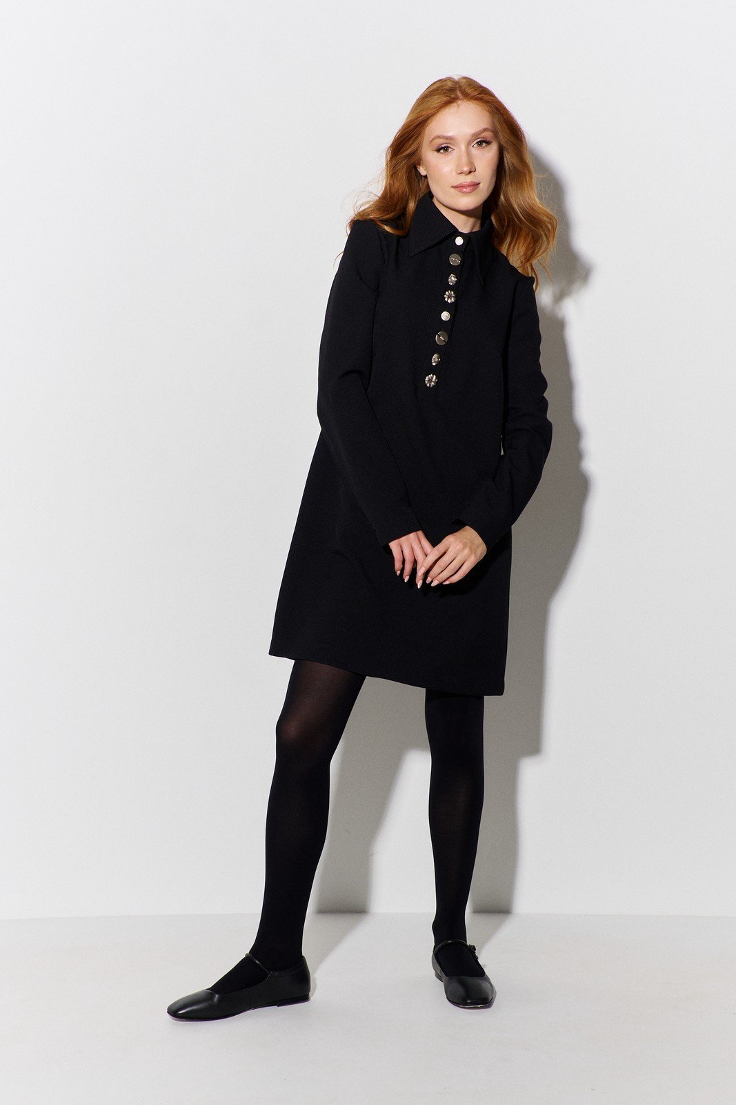 Платье прямого силуэта. Характеристики: выполнено из плательной ткани в черном цвете, воротник рубашечного типа с планкой на петли и пуговицы, рукав двухшовный. Длина платья 91 см, длина рукава 62 см.