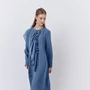 Платье прямого силуэта. Характеристики: выполнено из джинсовой ткани в синем цвете, воротник рубашечного типа с планкой на петли и декоративные пуговицы, рукав двухшовный. Длина платья 89 см, длина рукава 62 см.