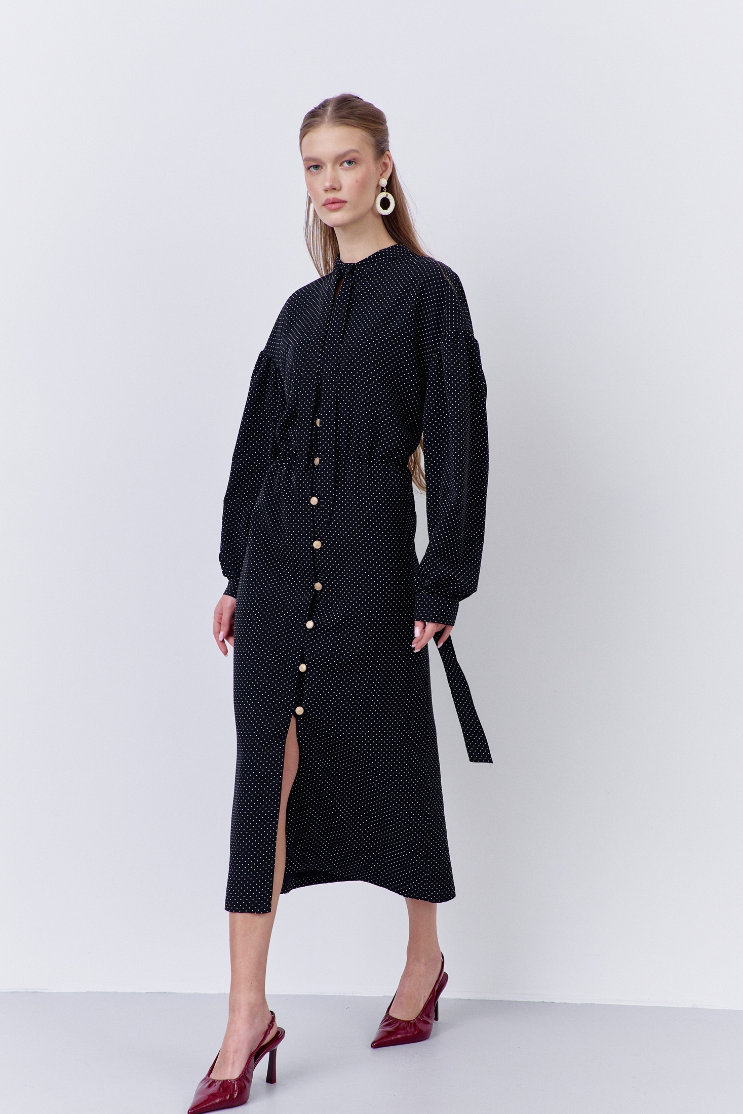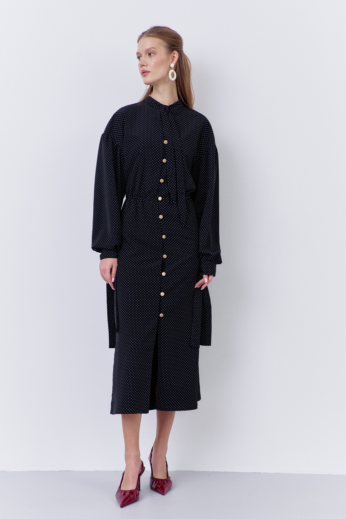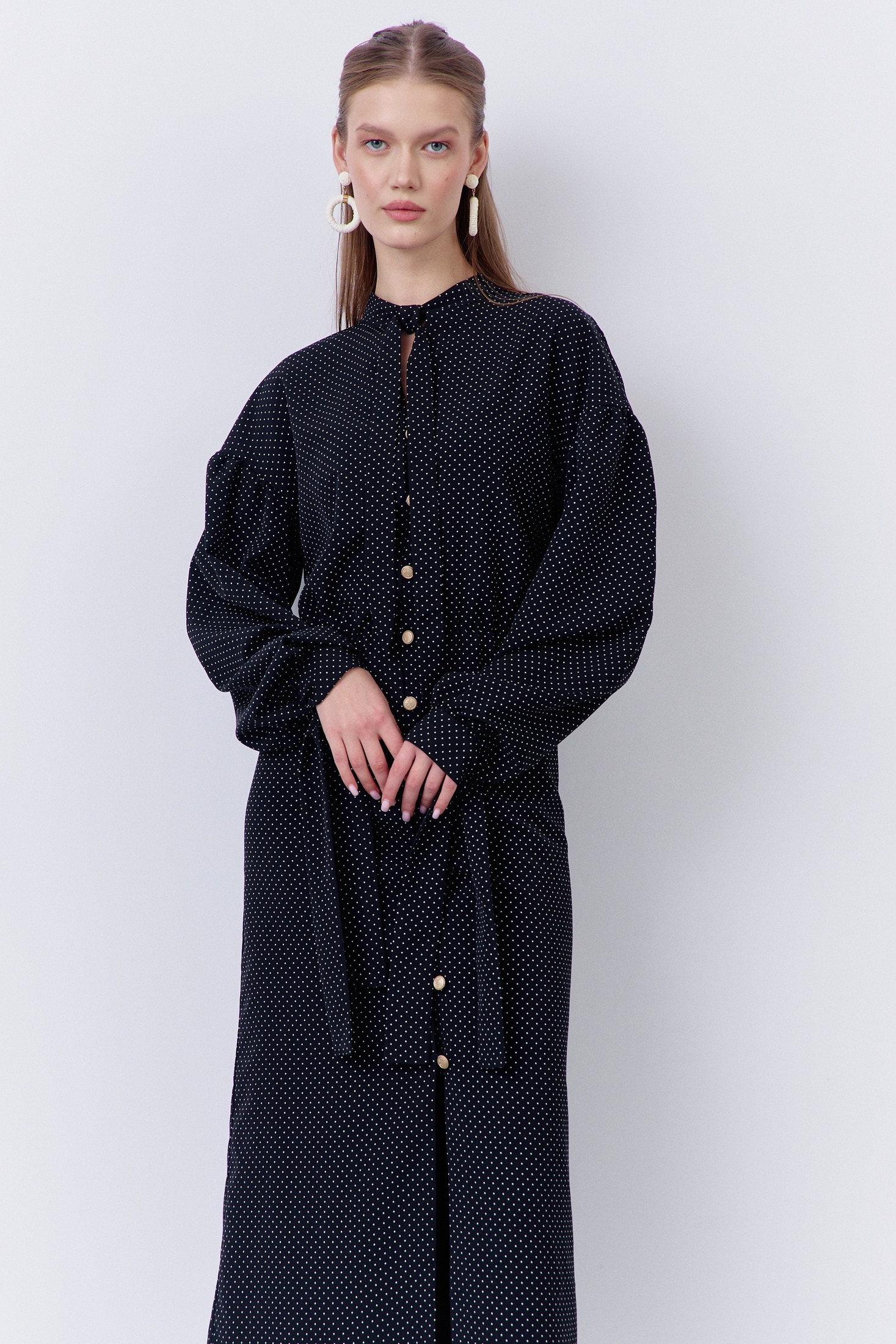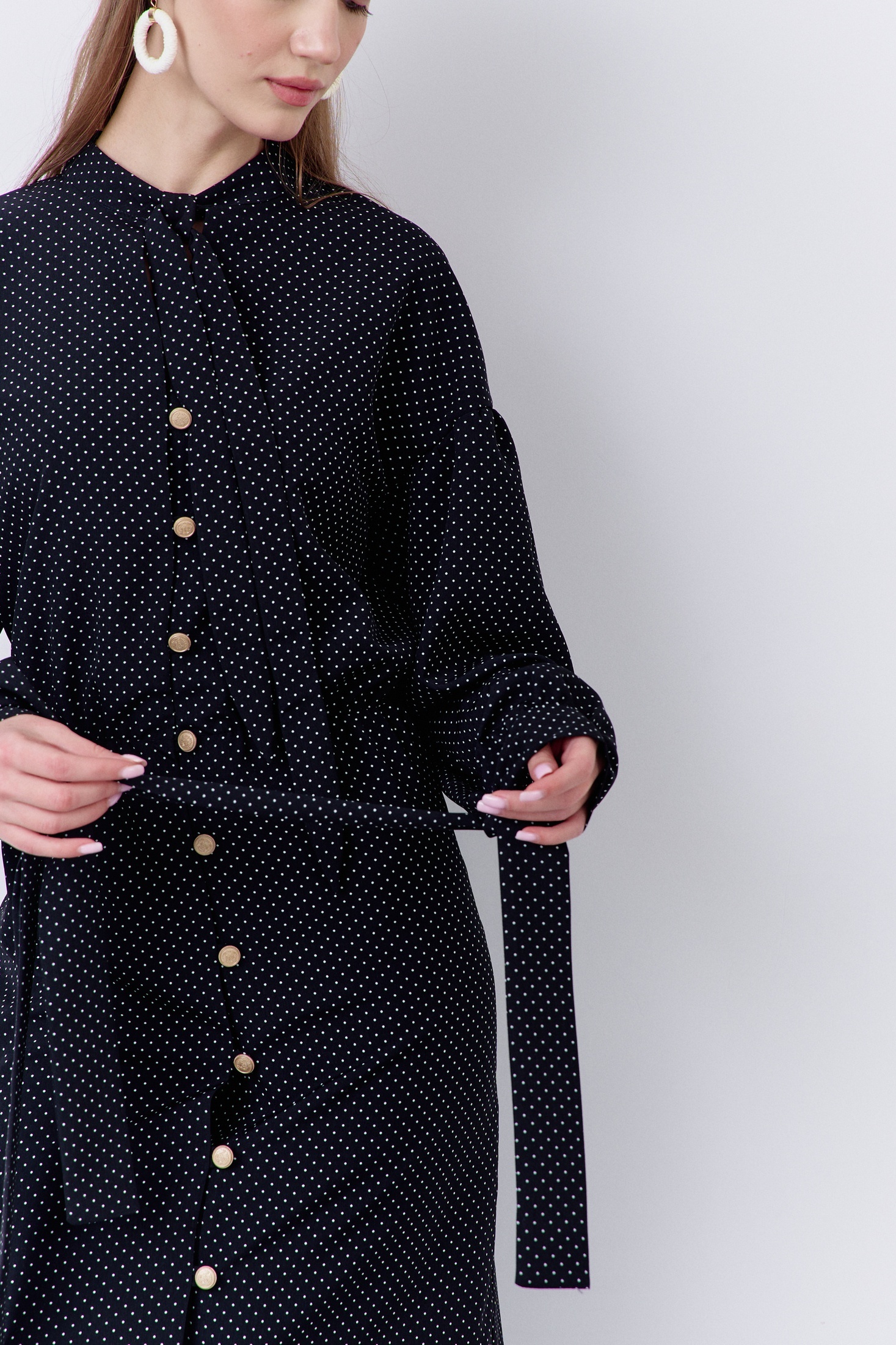 Платье 2063 черный горох FLAIM — это изысканный выбор для любого случая. Коллекция бренда FLAIM предлагает приталенное платье миди с оригинальным принтом в черный горох. Изготовлено из плательной ткани с включением вискозы и полиэстера, обеспечивающих комфорт и легкость. Центральная застежка на пуговицы и манжеты придают платью стильный вид. Воротник-стойка на завязку добавляет изюминку образу. Идеально подходит для весенне-осеннего сезона как на работу, так и на вечеринки. Черный цвет с гороховым принтом создают утонченный и универсальный стиль.