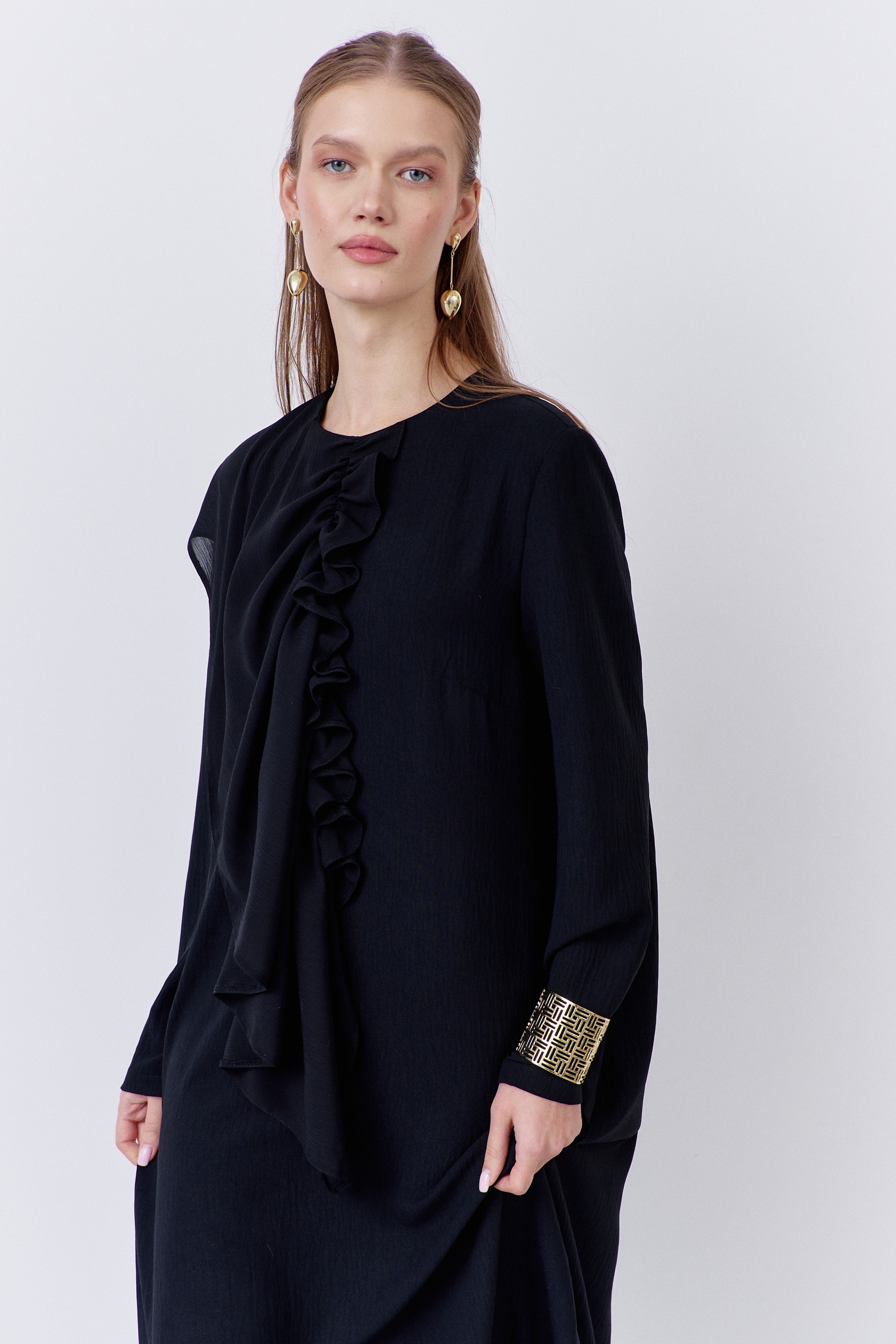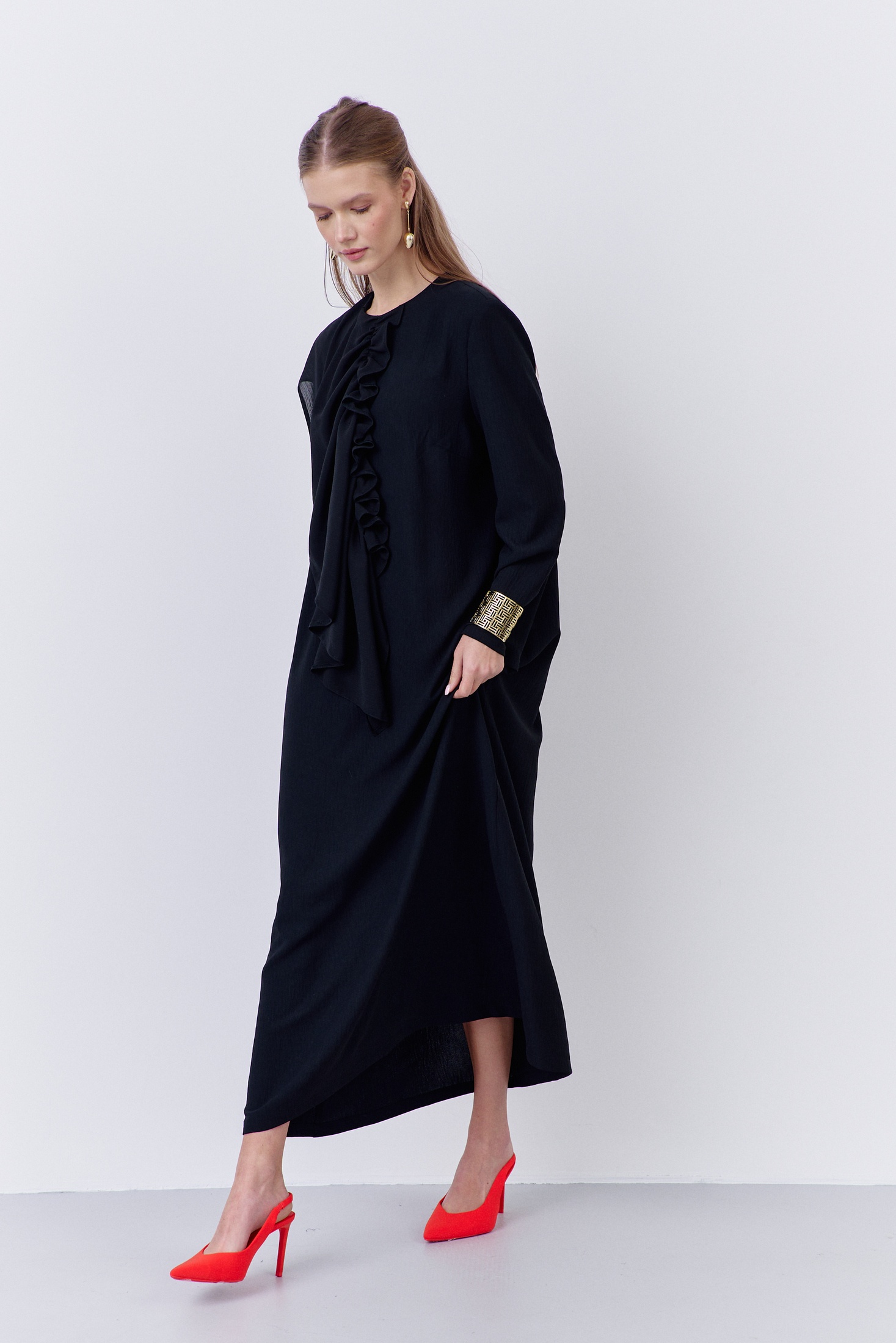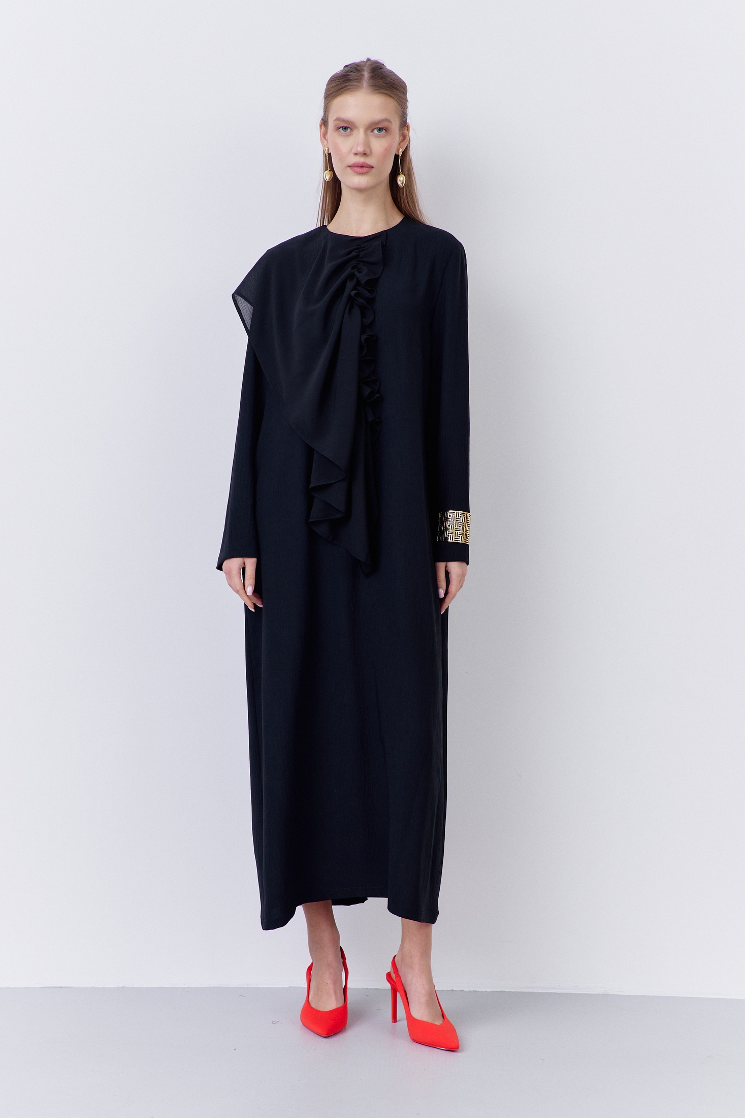 Платье 2067-01 черный FLAIM впечатляет своим прямым силуэтом и декоративным элементом по переду. Коллекция бренда FLAIM предлагает это платье из плательной ткани в черном цвете с элегантной застежкой-молнией по спинке. Изготовлено из комбинации полиэстера, вискозы и эластана, что обеспечивает комфорт и стиль. Шифоновый акцент добавляет уникальности и делает платье привлекательным для вечерних мероприятий. Черный цвет и миди длина делают его идеальным выбором для осеннего сезона и праздничных случаев.