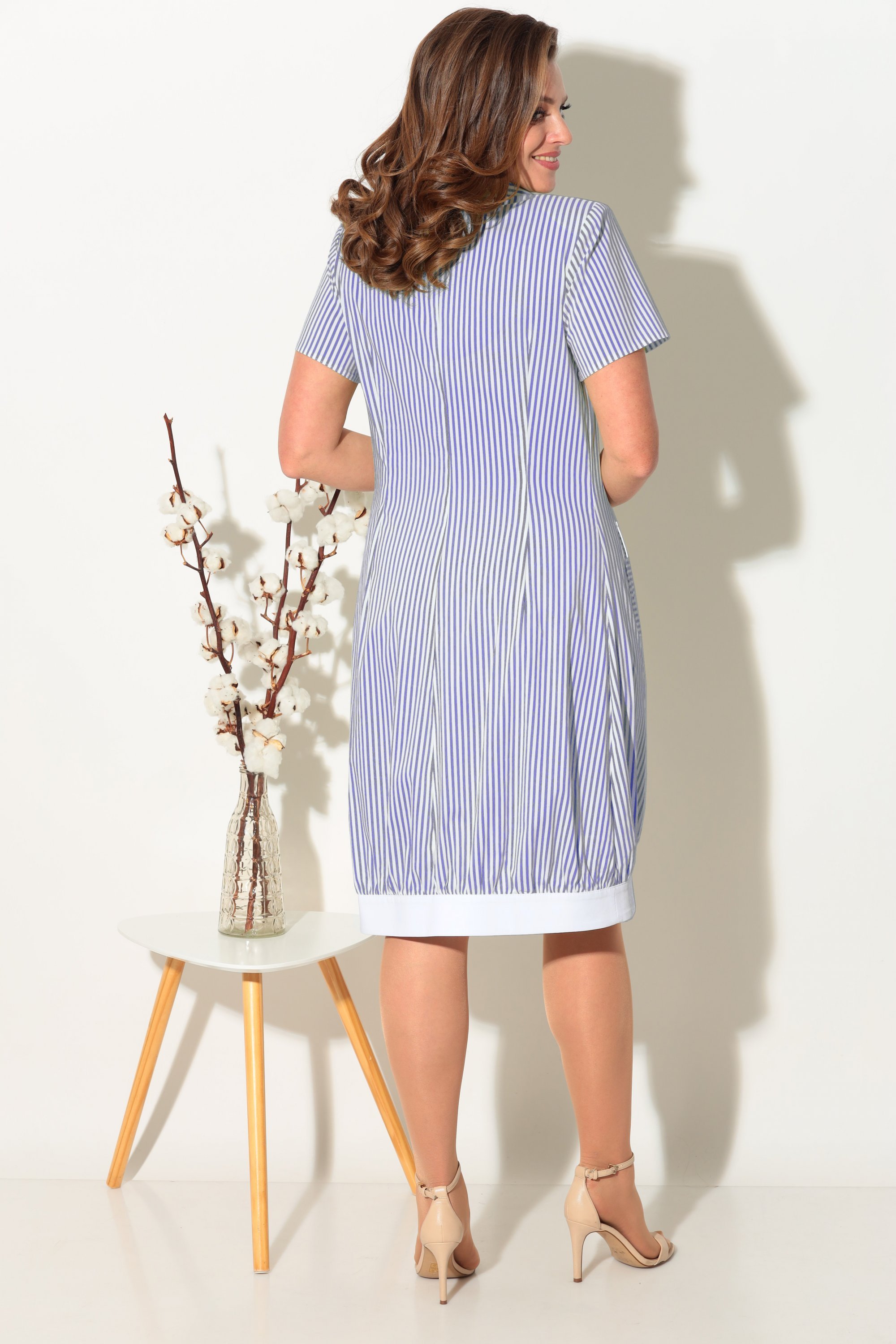 Платье-халад, из приятной хлопковой ткани. По переду имеется отделочная планка с застежкой на кнопках, а также накладные карманы с клапанами и листочками из отделочной ткани. Низ платья-халата присобран на отделочную планку. Перёд платья незначительно укорочен, спинка удленане. Воротник рубашечного типа на стойке. Рукав - короткий. Длина платья по переду в размерах 44-48 - 93 см., по спинке - 96 см. Длина платья по переду в размерах 50-54 - 98 см., по спинке - 101 см..