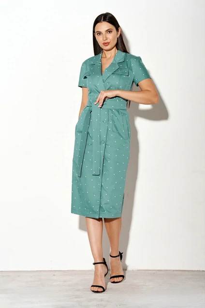 Нарядно-повседневное платье прилегающего силуэта с двубортной застежкой на петли и пуговицы. Рельефы по переду изделия для лучшего прилегания.Прорезной карман с листочкой.Рукав реглан-кокетка с втачным декоративным клапаном. Воротник пиджачного типа, спинка со средним швом. Платье со сьемным поясом.