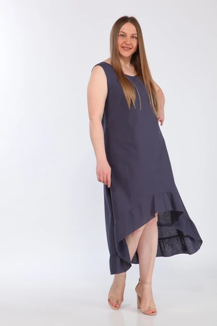 Платье-сарафан А-силуэта без рукавов, в боковых швах карманы, по ассиметричному низу декоративный валан, горловина и пройма обработаны окантовкой.