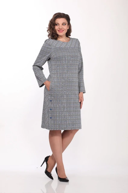 Элегантное платье полуприлегающего силуэта из текстильного полотна. Модель с аккуратной круглой горловиной. По переду на уровне бедра – складка с декоративными пуговицами и карманы в боковом шве. Рукава втачные, одношовные. Спинка со средним швом и шлицей.