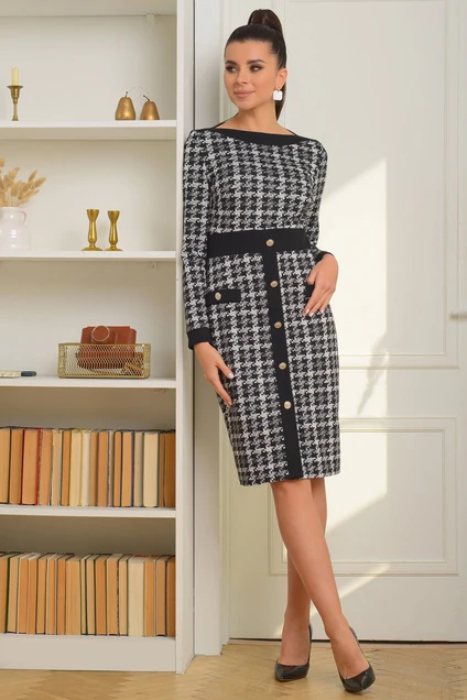 Платье женское выполнено из трикотажного полотна с небольшой растяжимостью. Платье отрезное по талии, хорошо приталено. Низ платья прямой, зауженный к низу. По переду от талии вниз расположена декоративная планка из отделочной ткани, которая внизу образует шлицу. Из отделочной ткани выполнены горизонтальные детали в области талии по переду и спинке, а также по манжетам рукавов и бейке горловины. В нижней части переда имеются декоравные листочки из отделочной ткани. Платье украшено красивыми пуговицами.