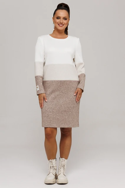 Женское трикотажное платье прямого силуэта является идеальным выбором для создания элегантного образа. Это платье длиной ниже колена (99 см) оформлено в трёхцветной гамме: верх белого цвета, середина светло-бежевого, а нижняя часть выполнена в цвете тёмного бежа. Рукава длинные (62 см), также трехцветные, что добавляет изысканности дизайну. Эта модель подходит для повседневного ношения и создает утончённый и стильный образ.