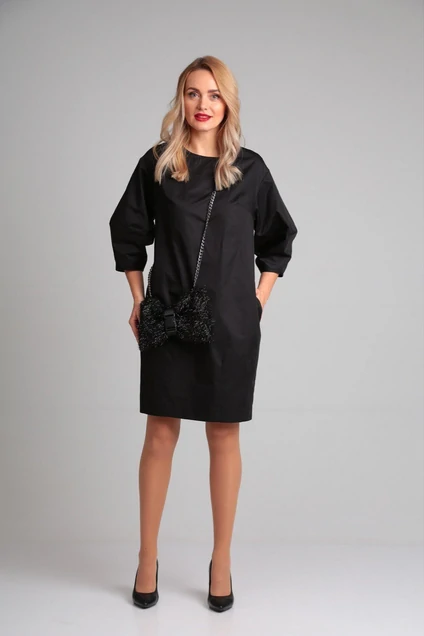 Платье свободного кроя, зауженного к низу силуэта "балон". По низу платья зашиты вытачки, что и создает силуэт "балон". Рукав втачной, со слегка спущенной линией плеча. Рукав 3/4, с подрезом, для расширения объема рукава, что создает интересный силуэт рукава. Вырез горловины круглый, по спинке потайная молния в горловине, для удобства одевания платья.Ткань из лащенного хлопка хорошо держит форму и не сковывает движения. Функциональные карманы в боковых швах. Сумочка входит в комплект. Нарядная, эффективная и функциональная, застегивается на надежный карабин. Шлейка сумочки с частичными вставками-цепочками. Длина платья 94см, длина рукава 55см.