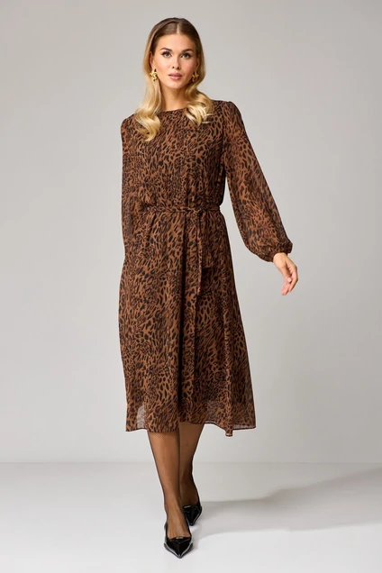 Платье женское А- образного силуэта из шифоновой ткани. Перед с двумя нагрудными вытачками. Спинка со средним швом, в верху обработан разрез с застежкой на петлю и пуговицу. Рукав одношовный втачной со сборкой по окату. Низ рукава на резинке шириной 2см. Горловина обработана подкладкой. К платью прилагается пояс из основной ткани. Платье на подкладке. Длина изделия по спинке- 115см., длина рукава 60см.