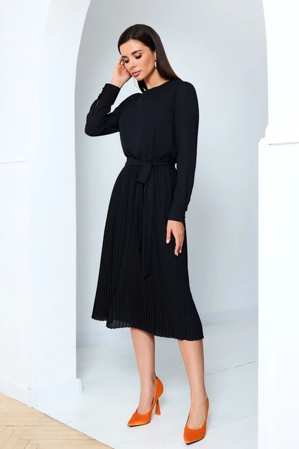 Платье прямого силуэта, отрезное по линии талии и приталеное с помощью резиночки, с юбкой плиссе. Перед с нагрудной вытачкой. В боковых швах шлевки. Горловина круглая, по спинке застежка капельна на одну петлю-пуговку. Рукав втачной со сборкой по окату с притачной манжетой с застежкой на одну петлю- пуговку. Платье на подкладке. Платье дополнено поясом из основной ткани. Длина платья - 113 см., рукава-62 см.