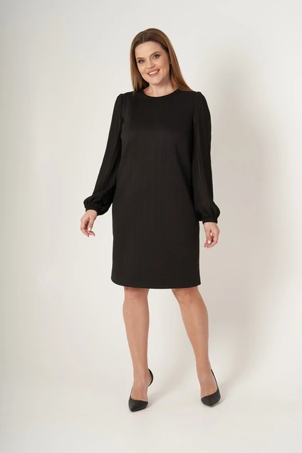 Платье А-силуэта с нагрудными вытачками из бокового шва. По горловине спинки обработан вырез-"капелька" с застежкой на пуговицу. Рукав одношовный втачной со сборкой по окату. Низ рукава с отрезной манжетой на резинке. Рукав выполнен из отделочной плиссерованной ткани. Длина спинки по среднему шву - 95 см, длина рукава-65 см.