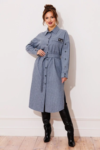 Платье прямого силуэта из плательной ткани. Перед с центральной застежкой. Воротник на стойке. Перед с нагрудными вытачками. На правой части платья сверху настрочен карман с клапаном. Спинка с кокеткой и складкой в нижней части. Рукав втачной рубашечного кроя с застежкой на петли и пуговицы. Низ рукава со складками на манжете, с застежкой на 2 петли и пуговицы. Низ платья фигурный, по бокам разрезы. К платью прилагается пояс из основной ткани с металлической пряжкой. На клапане настрочена декоративная нашивка. Фурнитура может быть изменена с сохранением художественного образа. Длина платья: 116 см, длина рукава: 47 см