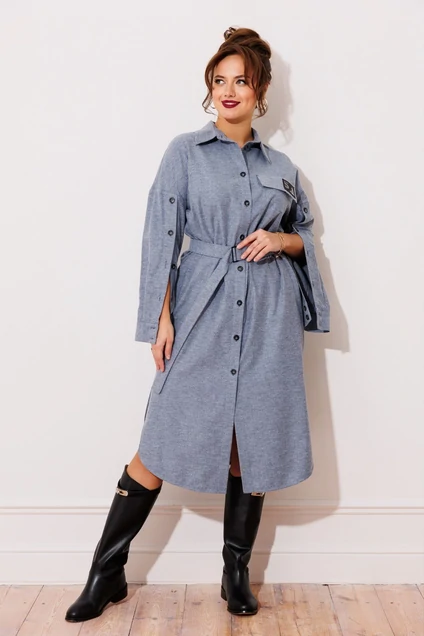Платье прямого силуэта из плательной ткани. Перед с центральной застежкой. Воротник на стойке. Перед с нагрудными вытачками. На правой части платья сверху настрочен карман с клапаном. Спинка с кокеткой и складкой в нижней части. Рукав втачной рубашечного кроя с застежкой на петли и пуговицы. Низ рукава со складками на манжете, с застежкой на 2 петли и пуговицы. Низ платья фигурный, по бокам разрезы. К платью прилагается пояс из основной ткани с металлической пряжкой. На клапане настрочена декоративная нашивка. Фурнитура может быть изменена с сохранением художественного образа. Длина платья: 116 см, длина рукава: 47 см