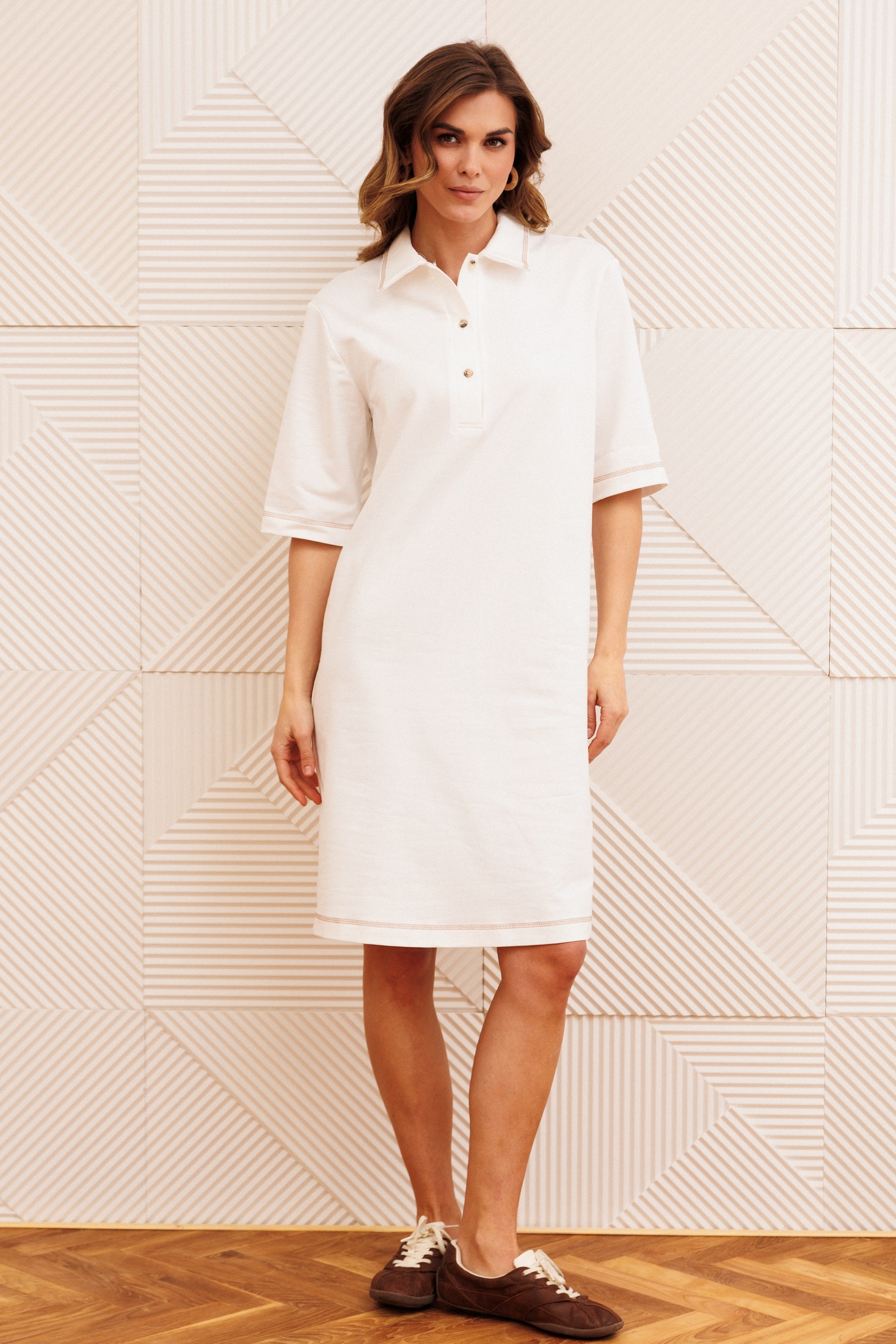 Платье 5394 молочный GIZART привносит в ваш гардероб комфорт и стиль. Коллекция бренда GIZART предлагает прямой силуэт с воротником поло, идеально подходящий для повседневного ношения. Изготовлено из хлопка с добавлением спандекса, что обеспечивает его легкость и эластичность. Молочный цвет и средняя длина 97 см делают его универсальным выбором для офиса или прогулок. Втачные одношовные рукава длиной 30 см подчеркивают лаконичный дизайн изделия. Отделочная строчка по низу изделия и воротнику добавляет изысканные штрихи. Это платье предназначено для ношения в теплые времена года, сочетая стиль и практичность.