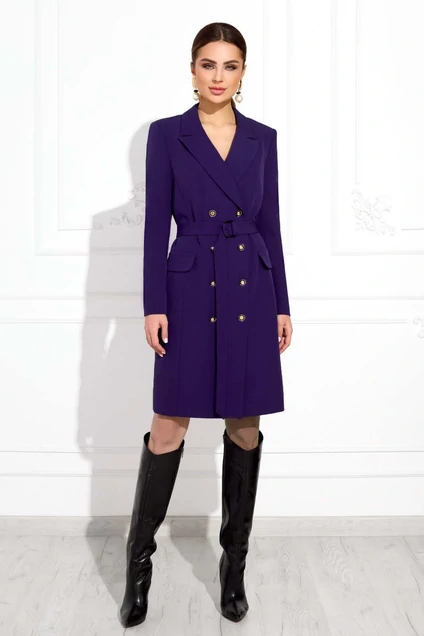 Платье прямого силуэта двубортное на четыре пары петель и пуговиц, с воротником пиджачного типа, с клапанами. Перед с рельефами и нагрудной вытачкой находящейся под лацканом. Спинка со средним швом, рельефами и шлицей. Рукав втачной двухшовный. Платье на подкладке. К платью прилагается пояс из основной ткани с металлической пряжкой.