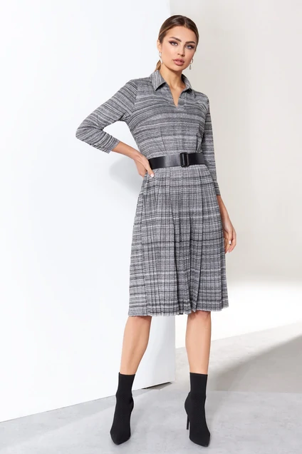 Платье полуприлегающего силуэта, отрезное по линии талии. На полочке две нагрудные вытачки, по горловине обработана V-образная планка со стояче отложным воротником. Рукав втачной .В боковом шве молния. Юбка плиссе. К платью прилагается ремень. Длина платья- 106 см, рукава-60 см. Фурнитура может быть изменена.