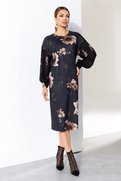 Платье полуприлегающего силуэта со спущенным плечом. На полочке две нагрудные вытачки. Спинка со средним швом , по центру спинки в области ростка обработана застежка в виде капельки. Рукава из плиссированного шифона по низу рукава манжета на резинке. Длина платья-110 см, рукава-50 см.