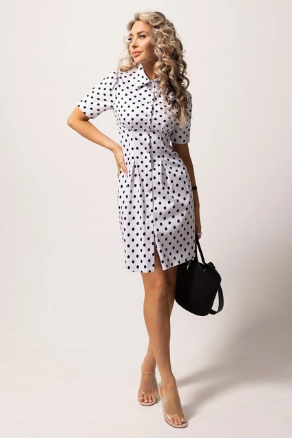 платье с центральной застежкой на петли и пуговицы, втачным воротником с отрезной стойкой. По линии талии полочек- встечные складки. Спинка со средним швом, рельефами, заканчивающимися встречными складками. Рукав втачной, короткий, окат рукава прсборен. По низу рукава- встречная складка.