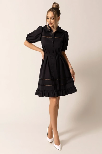Платье с центральной застежкой на петли и пуговицы, отложным воротником. По краю воротника- рюша. Полочки и спинка декорированы втачными кружевными деталями. По низу платья- рюша. Рукав короткий, втачной, со сборкой по окату и отрезной манжетой, присборенной на резинку. Платье со съемным поясом.