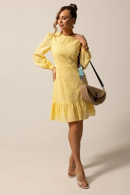 Платье без воротника, с круглым вырезом горловины, застежкой на потайную молнию в среднем шве спинки. Платье отрезное по линии талии. Верхняя часть переда с нагрудными и талиевыми вытачками, верхняя часть спинки со средним швом и талиевыми вытачками. Нижняя часть платья с отрезным воланом. Рукав длинный, втачной, с отрезной манжетой, застегивающейся на одну петлю и пуговицу.