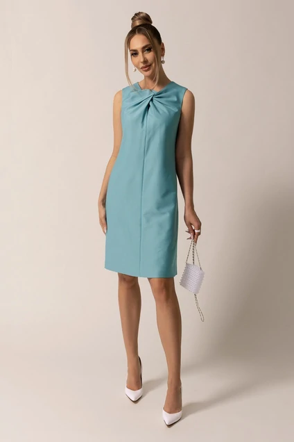 Платье без воротника, застежкой на потайную молнию в среднем шве спинки, с фигурным вырезом горловины, фантазийным узлом по горловине переда. По переду со средним швом. Спинка со средним швом, талиевыми вытачками. Платье без рукавов.
